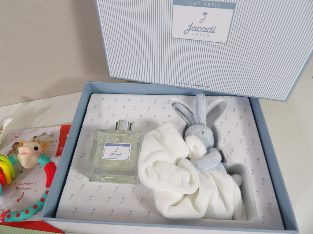 JACADI Coffret Tout Petit Eau de senteir 100ML + son doudou lapin; Fanfan Le faon, Liliputiens ROSALIE Peluche musicale et LENA Animal multi activités; DONE BY DEE Peluche multi activités, x2 Sophie La Griafe hochets et x1 VERBAUDET baton de pluie.
