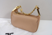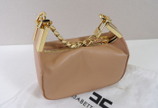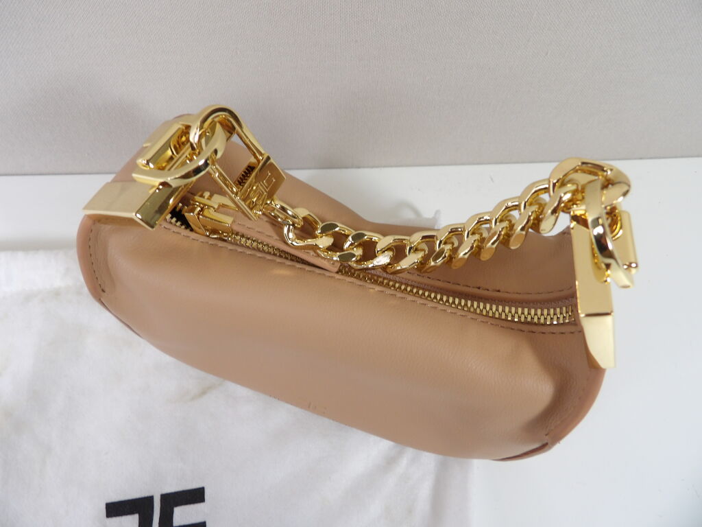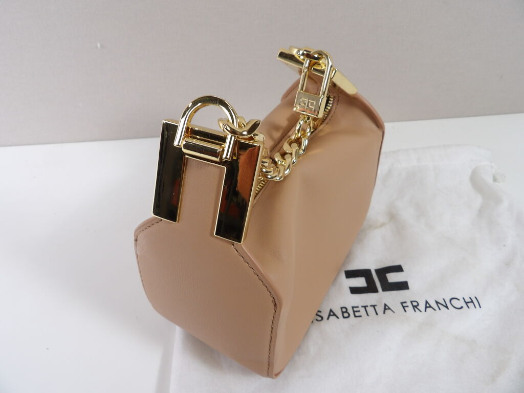 ELISABETTA FRANCHI - Petit sac à main en faux cuir camel rose, avec chaine dorée. (sans bandoulière), avec son dustbag. Fermeture zippée et petite poche intérieure zippée. Dimensions environ 18x12CM. Très bon état.