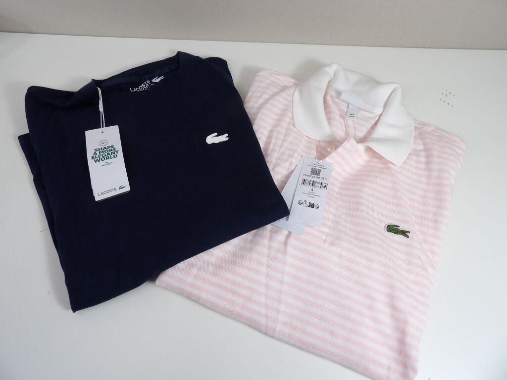 LACOSTE Lot de x2 articles neufs : Tshirt T40 et Polo rayé rose et blanc Taille 4. (Prévoir nettoyage)