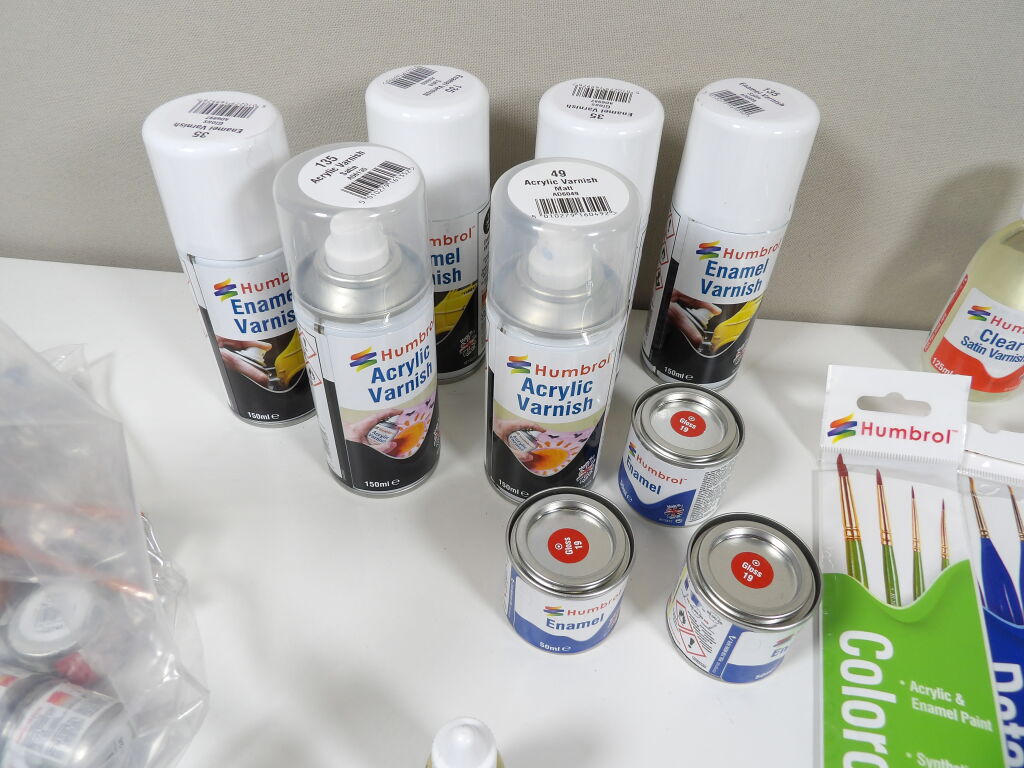 LOISIRS CREATIFS : Lot HUMBROL et autres : comprenant pinceaux, Bombes d'Acrylic varnish en spray, Vernis transparent satiné, et autres produits : émail, ...