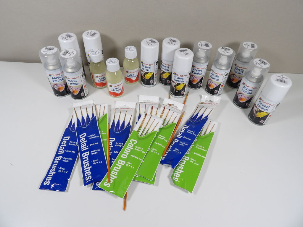 LOISIRS CREATIFS : Lot HUMBROL et autres : comprenant pinceaux, Bombes d'Acrylic varnish en spray, Vernis transparent satiné, et autres produits.