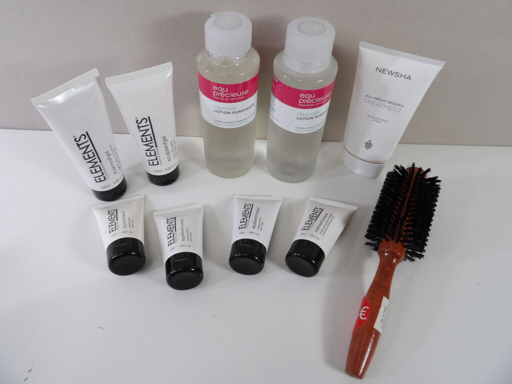 Lot de x10 articles neufs et occasion divers: x2 Eau précieuse, x4 Masques ELEMENT ainsi que x2 gels (soin silhouette et gel a effet chauffant), x1 NEWSHA, et une brosse.