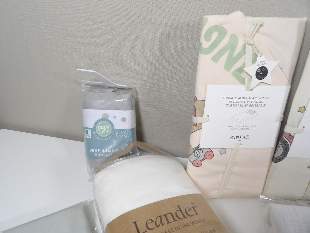 Lot de x12 articles neufs : draps, taie d'oreiller, gigoteuse, draps housse...