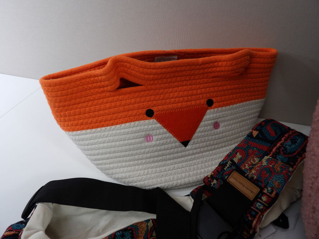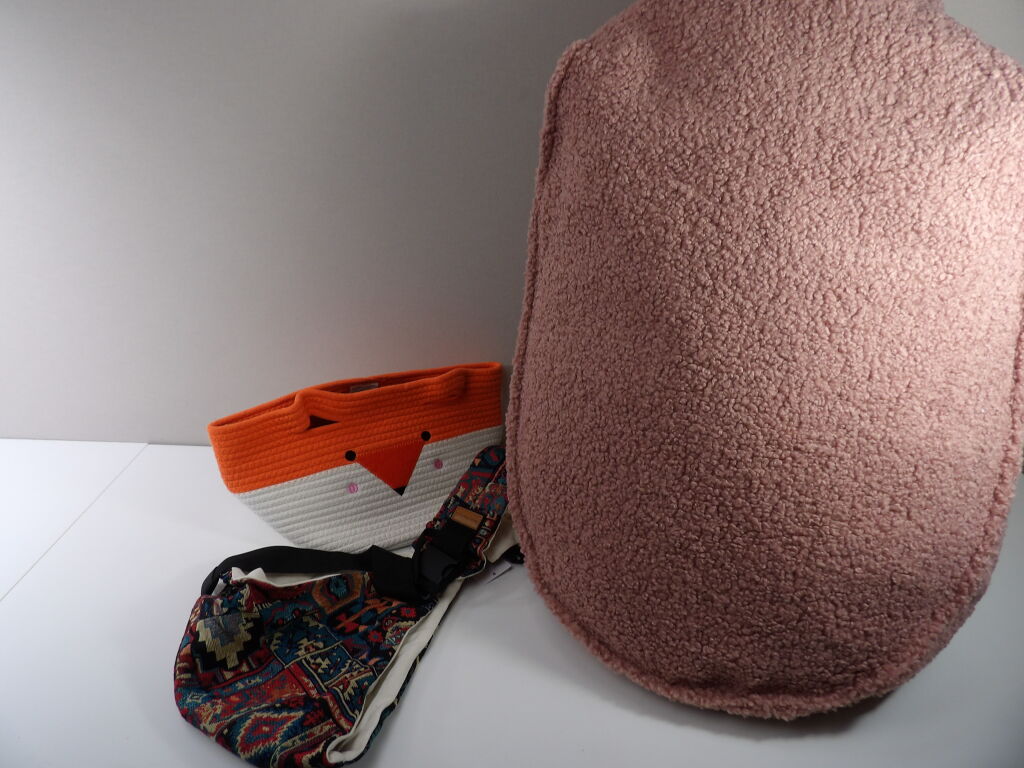 Lot de x3 articles neuf et occasion : Pouf Bear rose WIGAWAMA, Un porte bébé pour la hanche, et un petit panier renard.