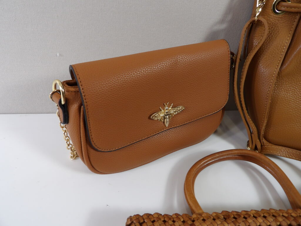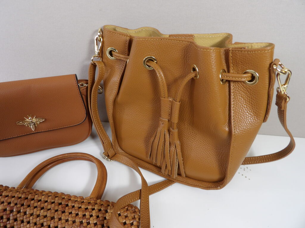 Lot de x3 sacs à main de coloris CAMEL - sans marques, en cuir et simili - états neufs : Sac seau env. 28x23CM, Sac à main avec fermeture abeille env. 21x13cm et sac tressé env. 28x20CM.