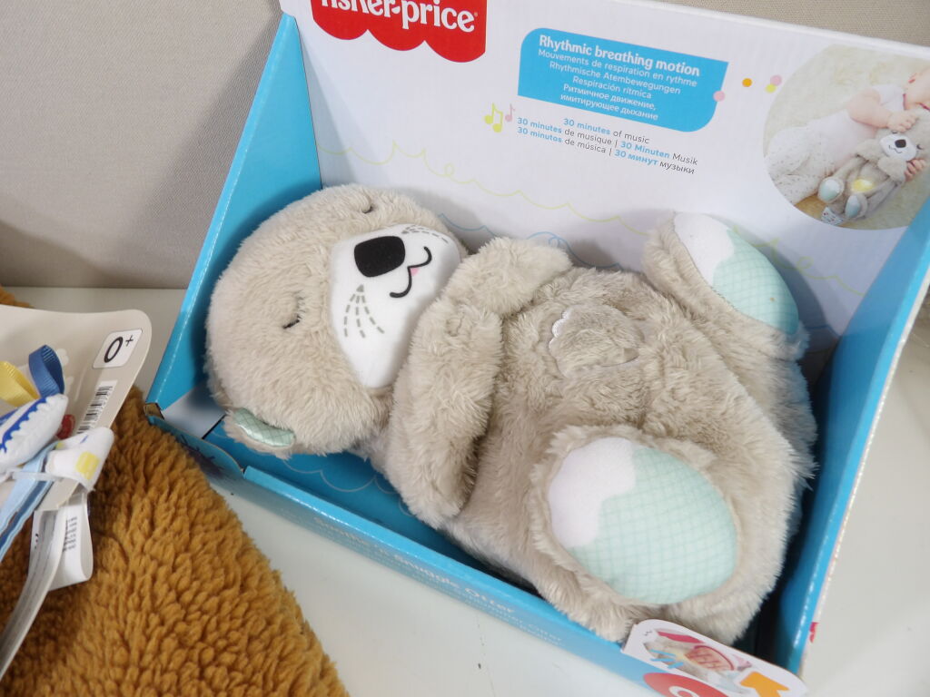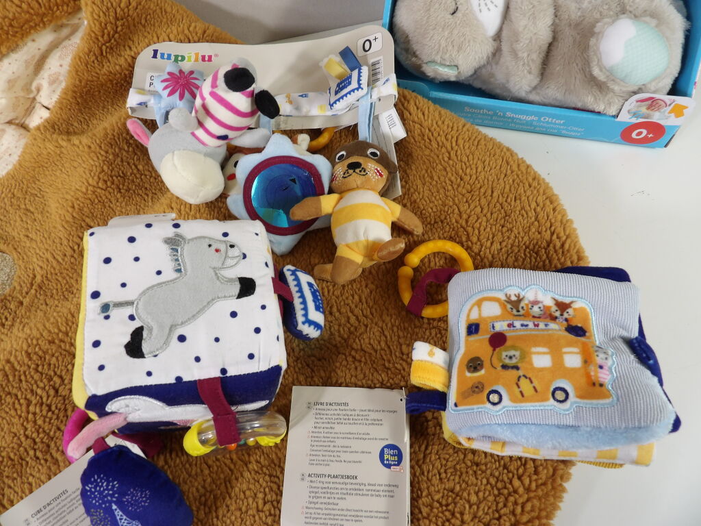 Lot de x4 doudous et petits jouets pour BÉBÉ neufs : dont Ma loutre calins bonne nuit; et on y inclut un NID D'ANGE neuf de la marque SAUTHON en 0-6 mois.