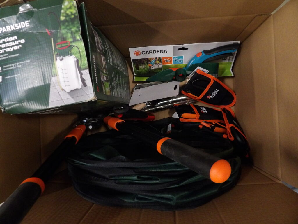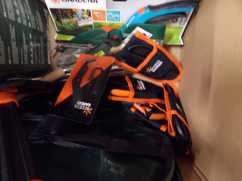 LOT ENTRETIEN EXTERIEUR NEUF + 25 pieces : Bac de dechet - Coupe branche - Secateur - Pulverisateur - Seau - GARDENIA etc...