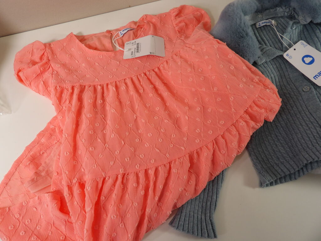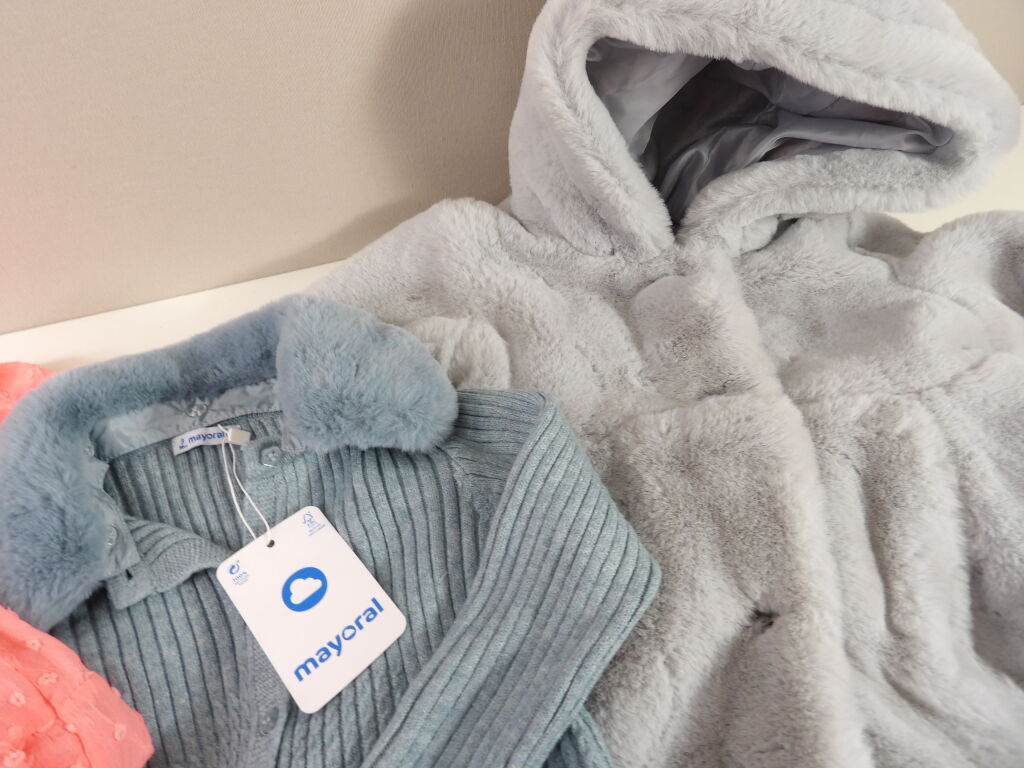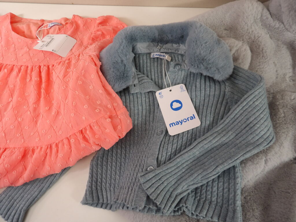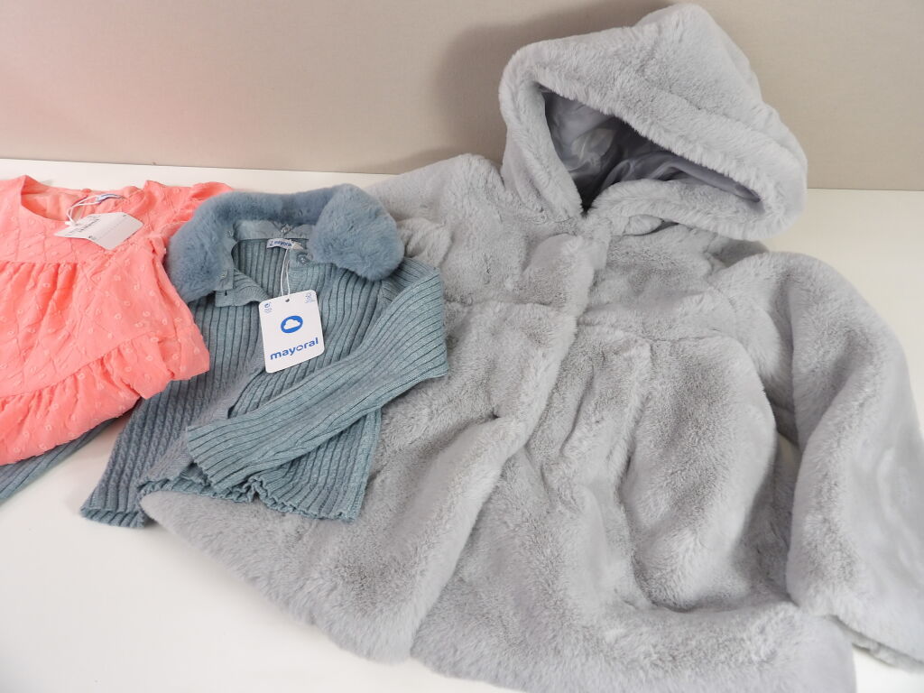 MAYORAL Lot de x3 articles : Gilet avec col fausse fourrure neuf Taille 3 (98CM); Robe neuve corail Taille 8 (128CM) et Blouson fausse fourrure grise d'occasion bon état en Taille 6 (116CM).
