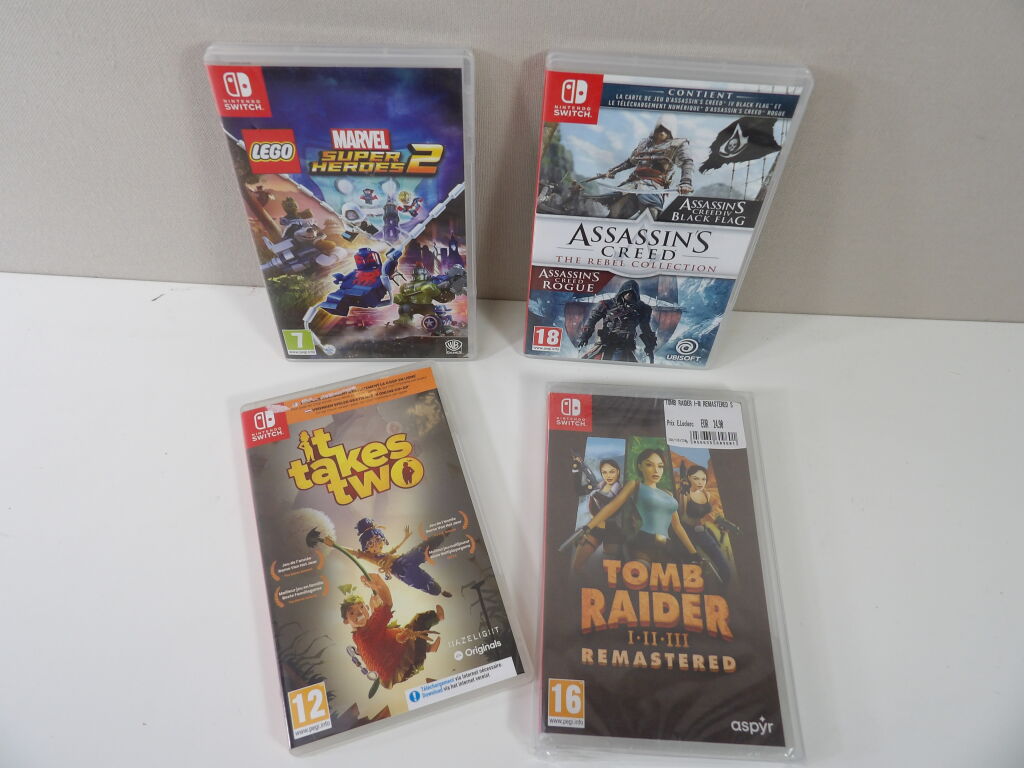 NINTENDO SWITCH : Lot de x4 jeux d'occasion et neuf : MARVEL Super Heroes 2, Assassin's creed The Rebel Collection, Tomb Raider I-II-III REMASTERED (neuf sous blister) et IT TAKES TWO.