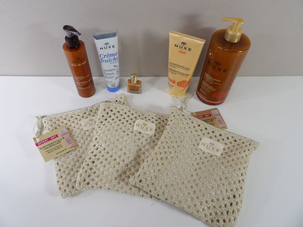 NUXE Lot de x5 articles neufs et occasion :x1 gel nettoyant et démaquillant visage 200ML, x1 crème fraiche de beauté 3 en 1 de 100ML, x1 mini huile prodigieuse or, x1 Shampoing douche après-soleil 750ML, et x1 lait fraicheur après soleil 200ML. On y inclut x3 pochettes.