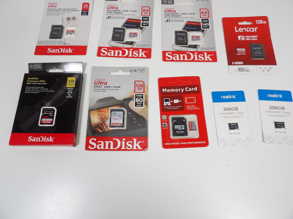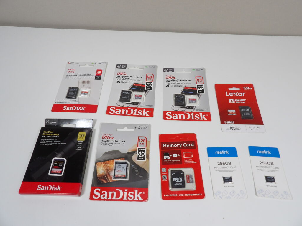 PHOTOGRAPHIE - Lot de 9 cartes mémoires - Cartes SD - Micro SDXC - Neufs - Différentes capacités et marques: Redlink, Sandisk, Lexar