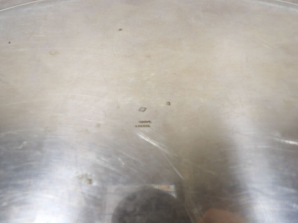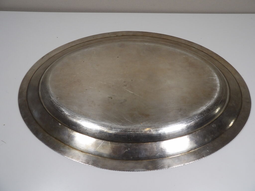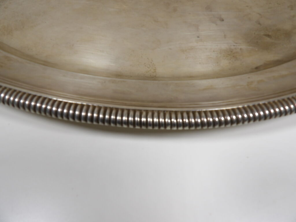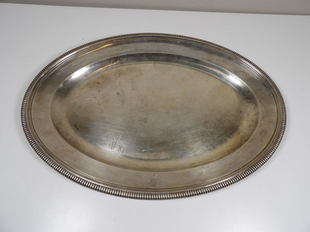Plat ovale en argent (poinçon minerve), orfèvre Odiot (Paris) style empire, gravé aux armoiries de la branche des barons de Viviers (Berthier de Chemilly de Viviers). probablement commandé par Théodore Berthier de Chemilly de Viviers (1783 Tonerre-1855 Paris), 1er baron de Viviers. 49 x 35 cm, poids brut (1,8 kg), rayures.