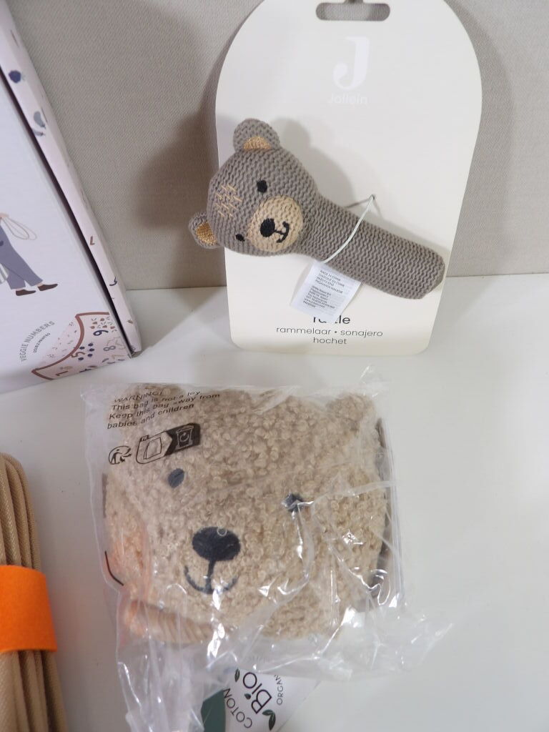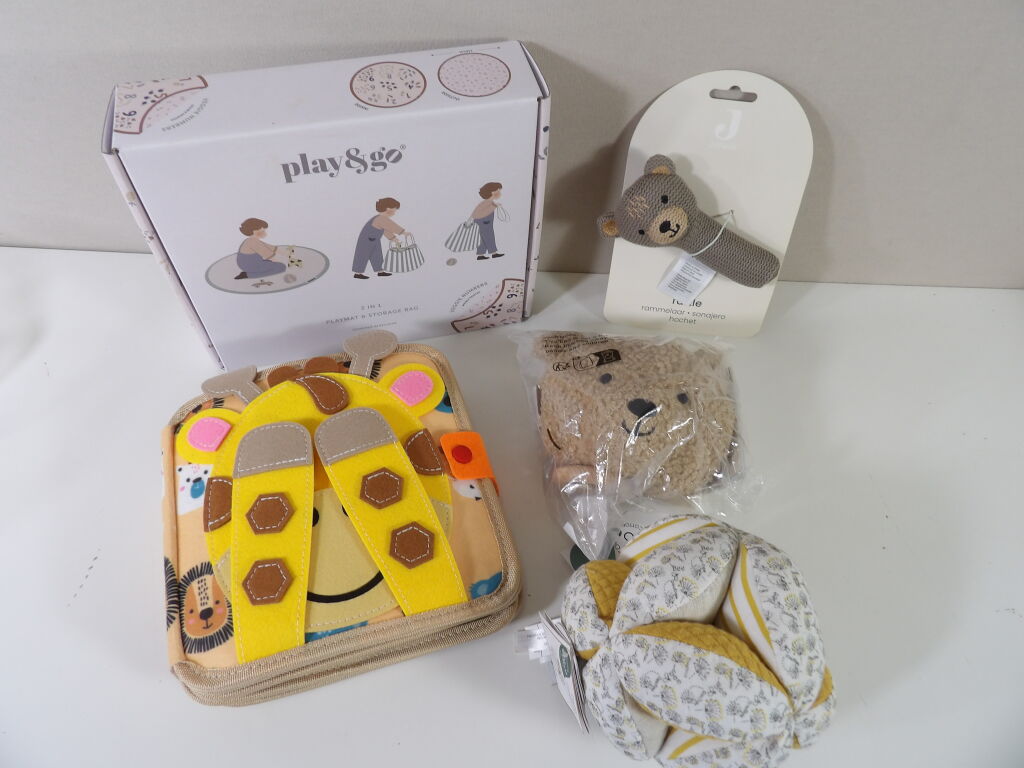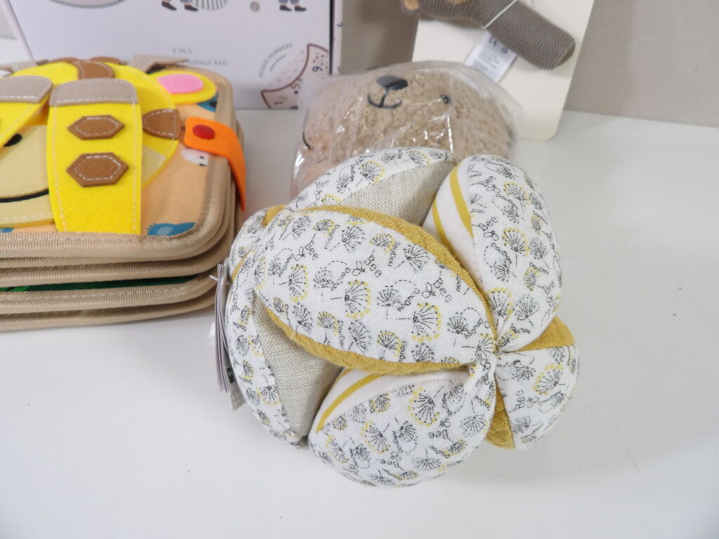 -On y inclut x4 petits jouets : Neufs: Balle sensorielle Doudou Compagnie, Hochet et peluche musicale Jollein, et D'occasion très bon état: Livre d'activités.