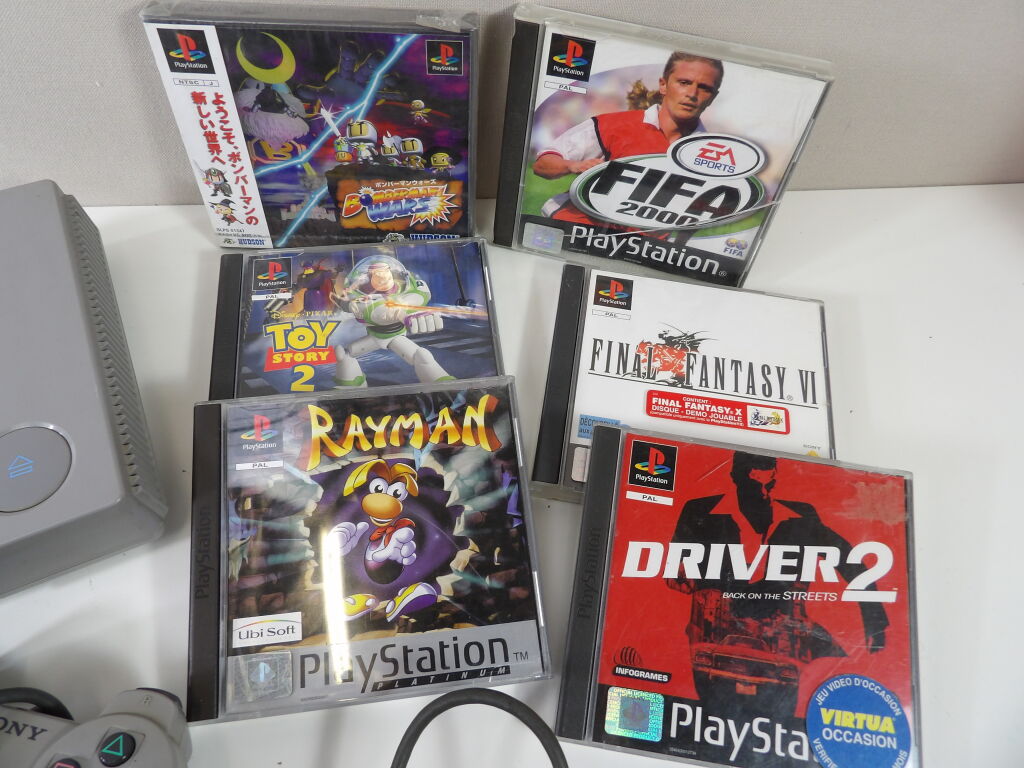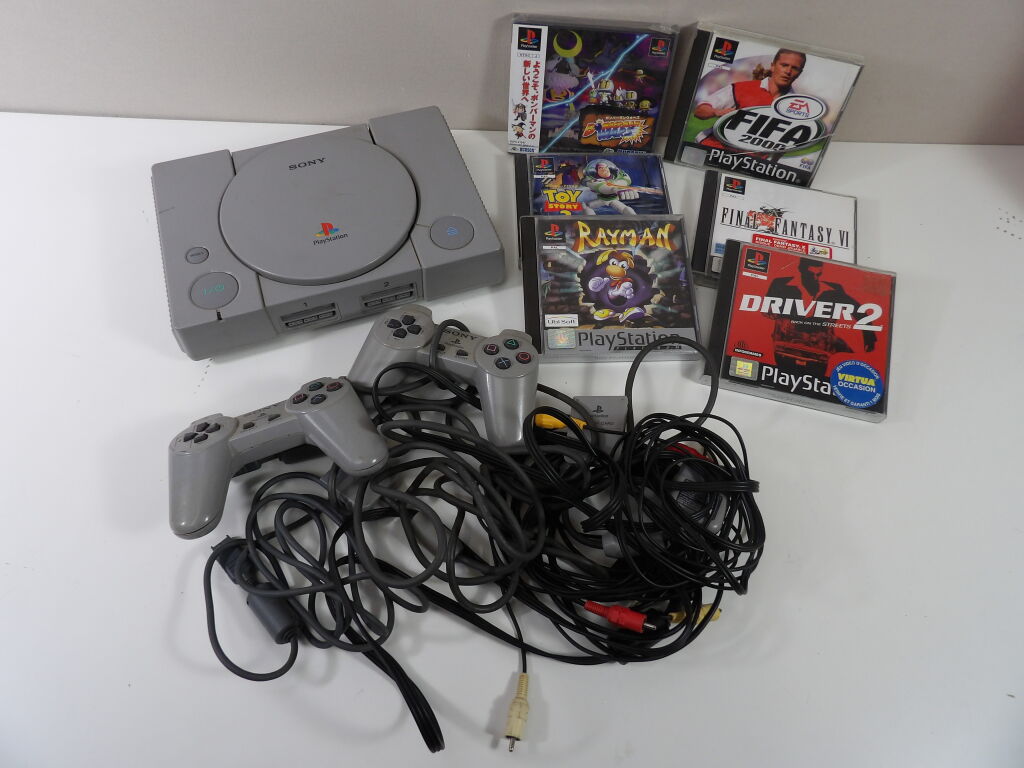 PLAYSTATION : Console de jeux vidéos d'occasion (testée et fonctionnelle), avec x2 manettes, x1 carte mémoire, et x6 jeux. Tous d'occasion.