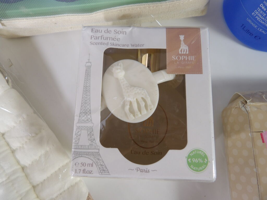 PRENDRE SOIN DE BÉBÉ : Lot de x5 articles neufs: SONARIN Sac à langer beige avec petits oursons, x3 couvertures d'emmaillotage 60x60; Eau de soin parfumée SOPHIE LA GIRAFE 50ML, Trousse soins URIAGE BÉBÉ Soins dermo-pédiatriques éco responsables; et 1ere eau nettoyante 1L (descellé).