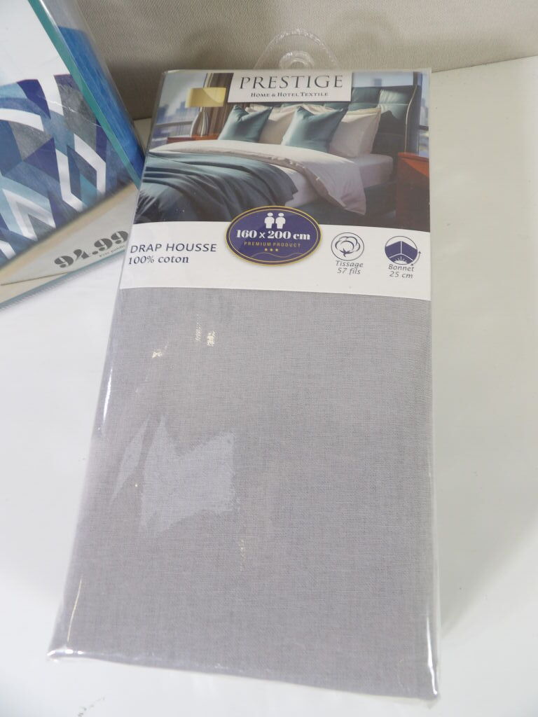 PRESTIGE Parrure de lit: Housse 220x240cm, Drap housse 160x200 +25cm, et 2 taies d'oreillers 65x65cm. On y inclut un drap housse 100% Coton de la même marque.