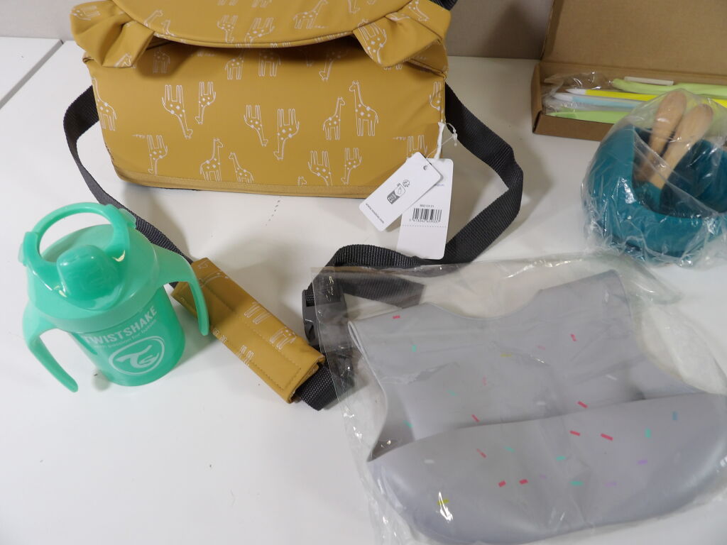 REPAS pour bébé / enfant : lot de x7 articles neufs : Disney Baby le roi lion assiette, verre..., gourde Twistshake, couverts dont TRIXIE, et bavoir en silicone. On y inclut un réhausseur chaise déperlant, ocre avec petits girafes NOUKIE'S - neuf !