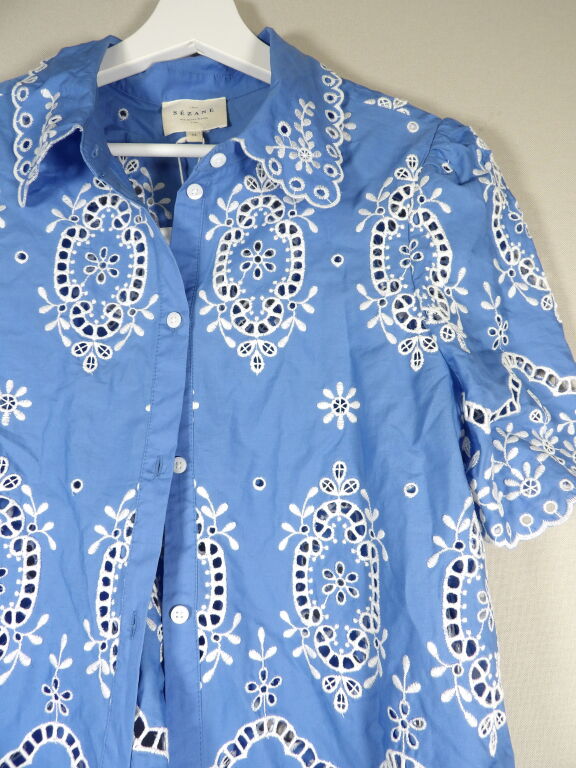 SEZANE Lot de x5 vêtements printemps / été en Taille 42 : Joli chemisier bleu broderie anglaise ELVIRA, Combinaison short kaki BENITA avec sa ceinture, Short New Rome ecru, Short vichy beige foncé EDWARD et un top JUAN noir en XL.