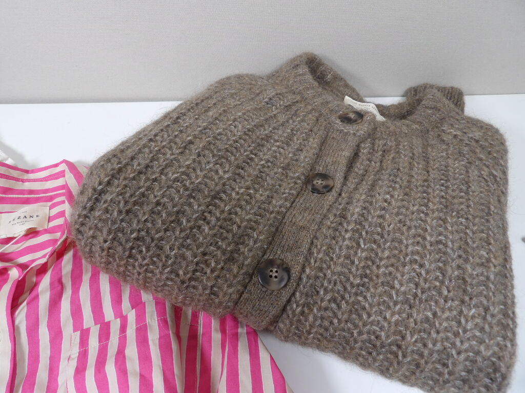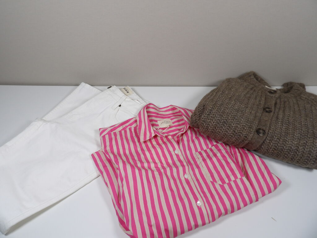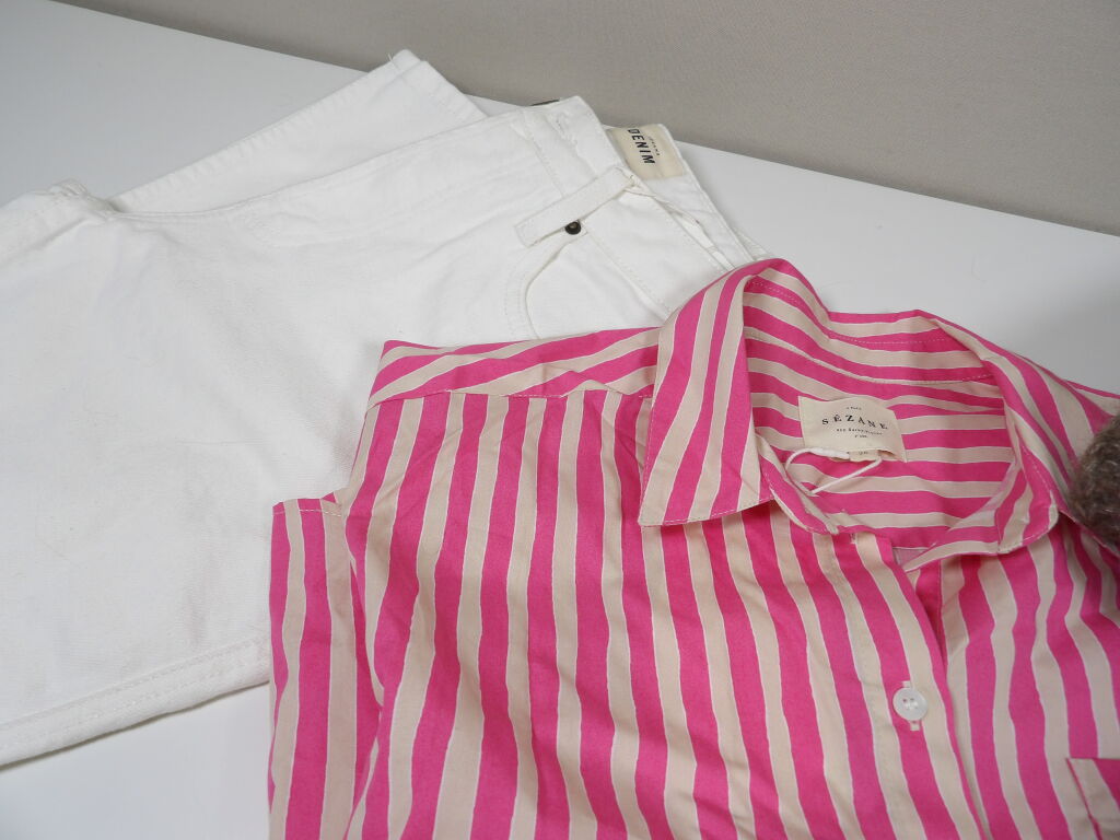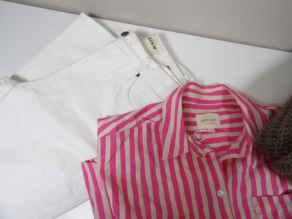 SEZANE - Un ensemble de trois articles en Taille S : Gilet EMILE Taupe , Jeans Brut sexy Tall (T.27) et pour compléter le look : une chemise rayée rose et ecru MAX.