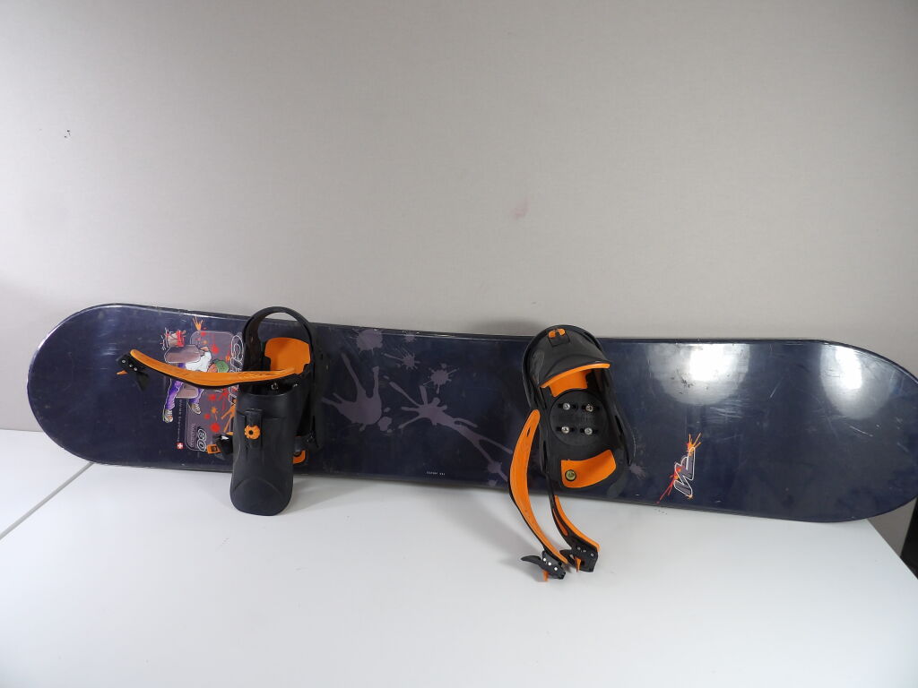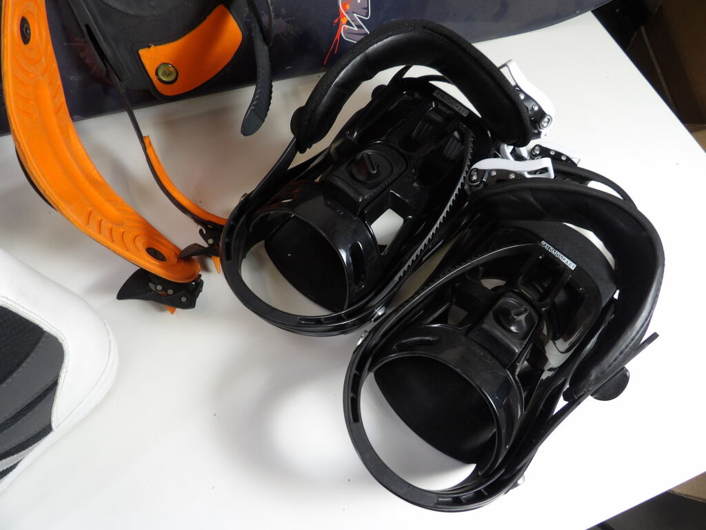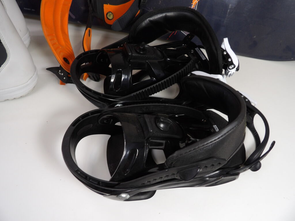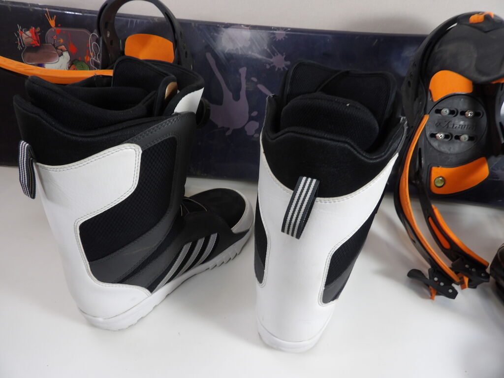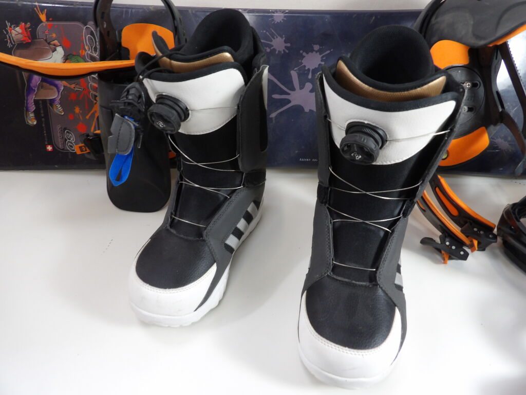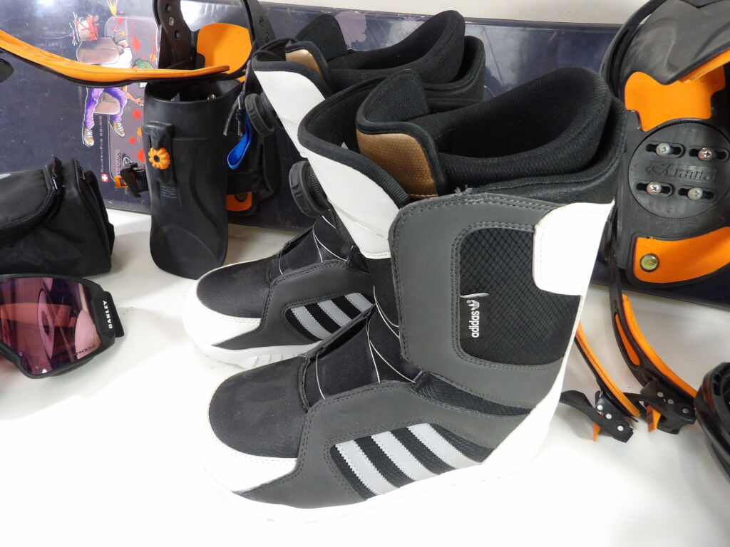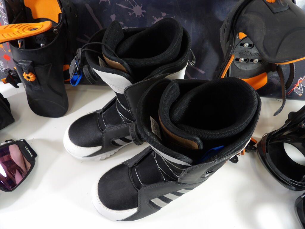 SNOWBOARD - Lot de x4 articles d'occasion vendus en l'état - : Planche de snow avec bottes de snow en taille 42 (Adidas), fixations Salomon Pact, et lunettes de soleil Oakley.