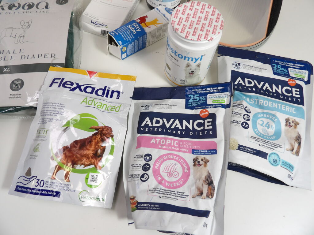 SOINS du chien : Lot de divers : anti-parasitaires, compléments alimentaire, shampoing, colerette, couche, aide à l'hygiène digestive ....