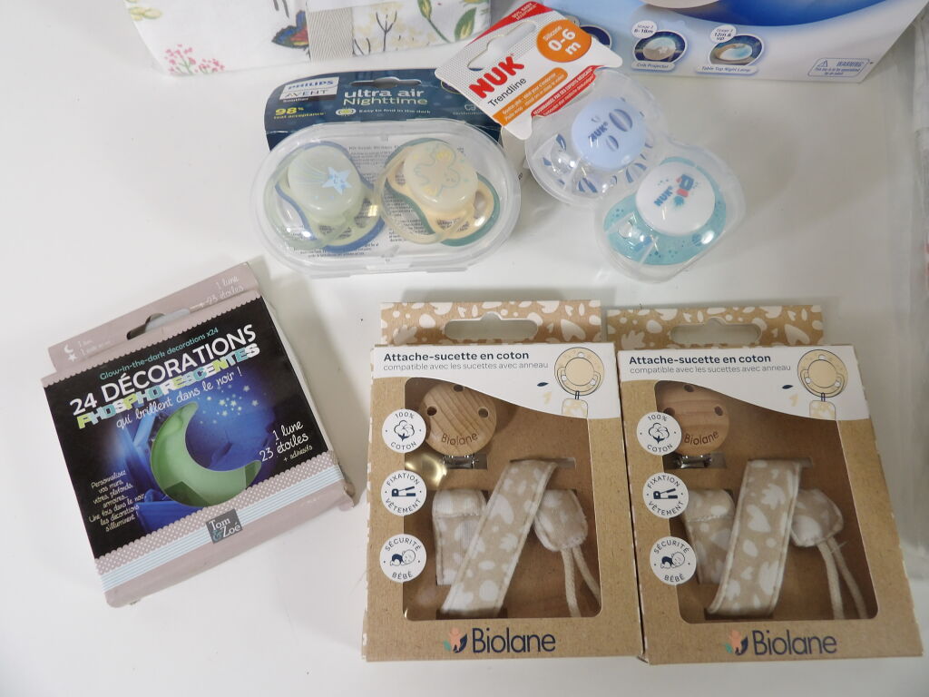 SOMMEIL pour BÉBÉ lot de articles neufs et occasion: x2 attaches sucettes Biolane, x2 packs de tétines 0-6 mois, des petites décorations phosphorescentes, x1 veilleuse, x1 VERBAUDET housse de couette 140x200 + taie d'oreiller 50x75cm et on y inclut x1 drap pour matelas à langer H&M Home x Disney Home 60x120CM neuf.