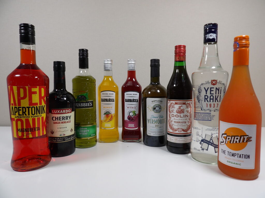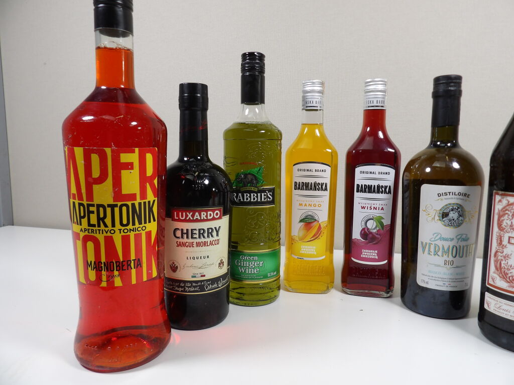 Spiritueux, pour vos cocktails : 9 bouteilles dont 2 de vermouth (1 rouge Dolin 75 cl et 1 blanc Distiloire Douce folie bio 75 cl), liqueurs Barmanska 2 bouteilles de 50 cl (mangue et cerise) liqueur Luxardo Cherry Sangue Morlacco (70 cl) Crabbie's green ginger wine (70 cl), spritz The Temptation prêt à boire (75 cl), Apertonik (préparation pour Spritz) 1L. et une bouteille de raki