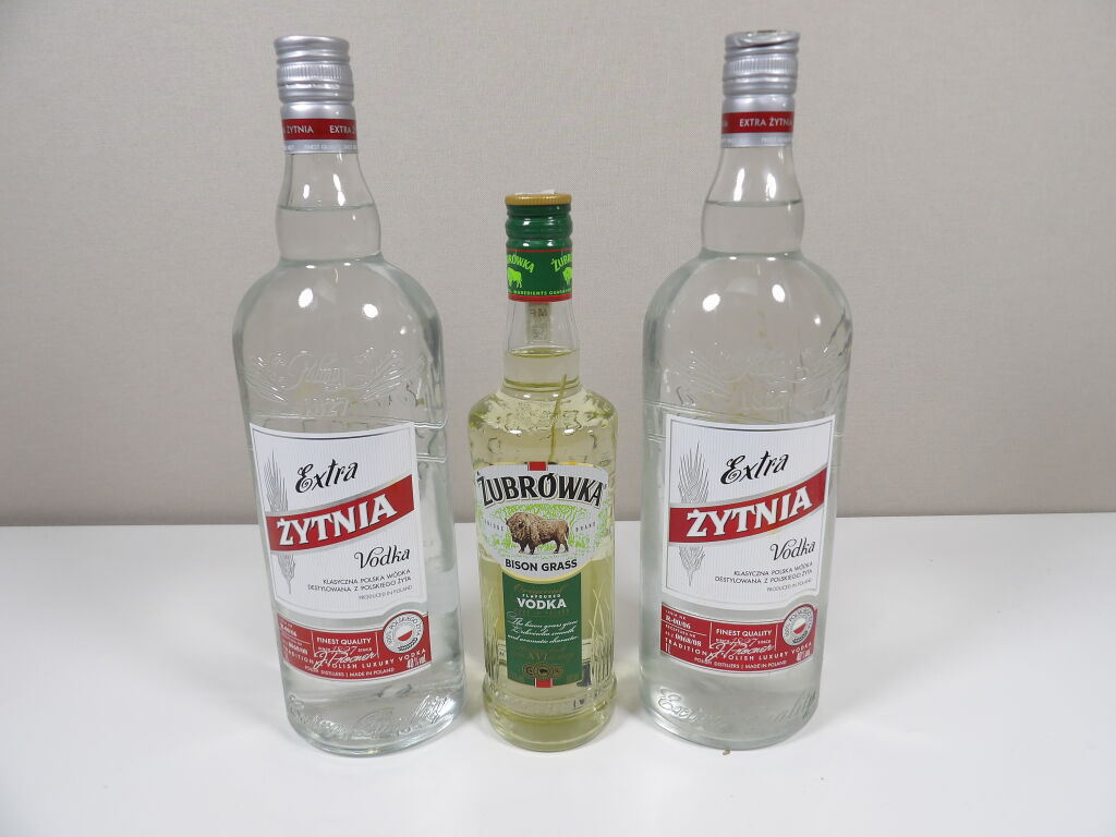 Spriritueux : Vodka 3 bouteilles 2 x Extra Zynta 1 L. (vodka polonaise dont une bouteille bouchon abîmé) et Zubrowka 0,5 L.