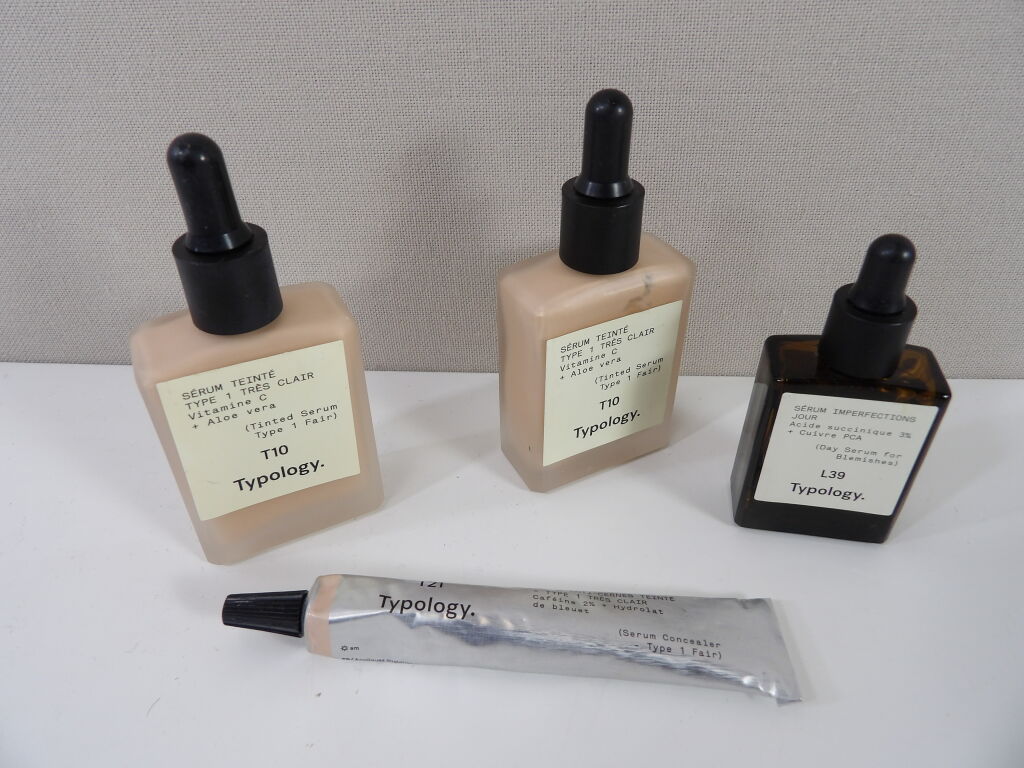TYPOLOGY - Lot de x4 articles neufs : x2 Sérum teinté type 1 très clair T10 30g, x1 sérum anti cernes teinté type 1 très clair T21 15ML et x1 Sérum imperfections jour acide succinique 3% + cuivre PCA L39 de 15ML.