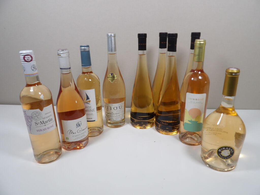 Vin rosé : 10 bouteilles dont 4x Obélo Côtes de Provence 2022, vin corse Sunrose 2024, Miraval (Côtes de Provence 2024, Languedoc Mas Granier cuvée Parenthèse2024, IGP Méditerrannée Brise Marine 2024, côteaux de Béziers "Le Bijou" de Sophie Valrose 2024 et un pays d'Oc réserve Saint Martin