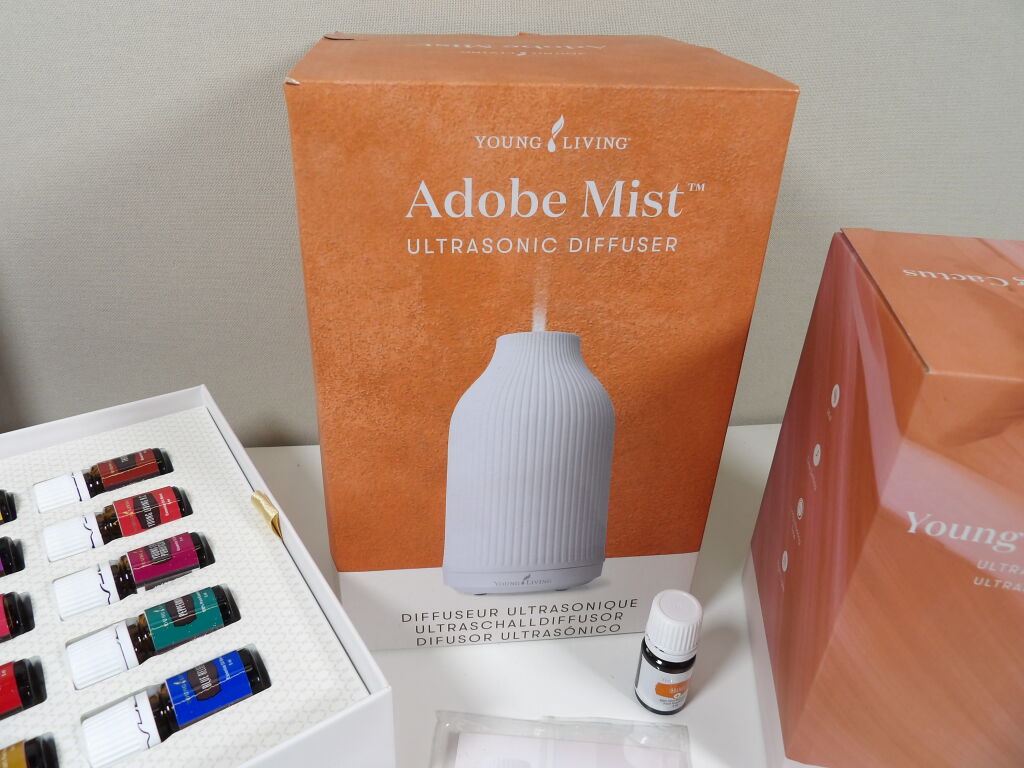 YOUNG LIVING - Diffuseur ultrasonique Adobe Mist NEUF (boite descellée), avec petit diffuseur ultrasonique Cactus (en beige) neuf aussi (boite descellée) et on y inclut un coffret d'huiles essentielles - from our FIELDS to your family.