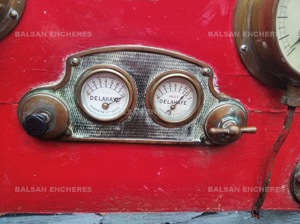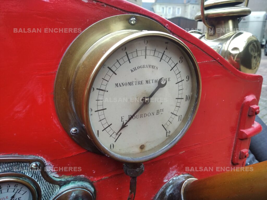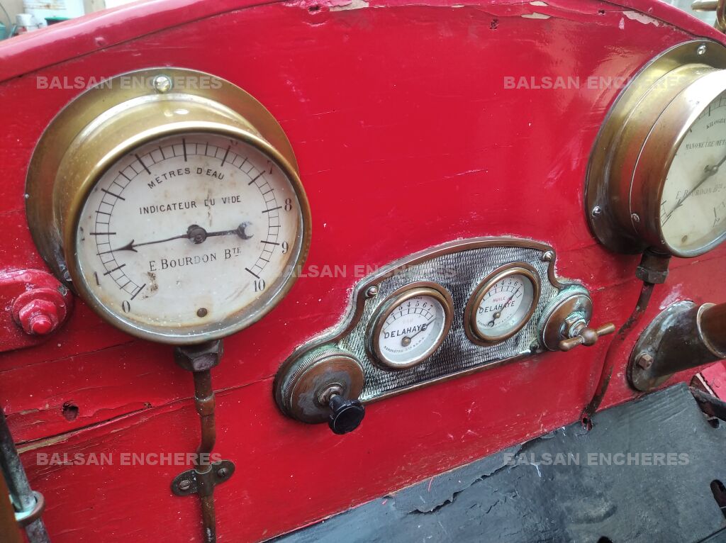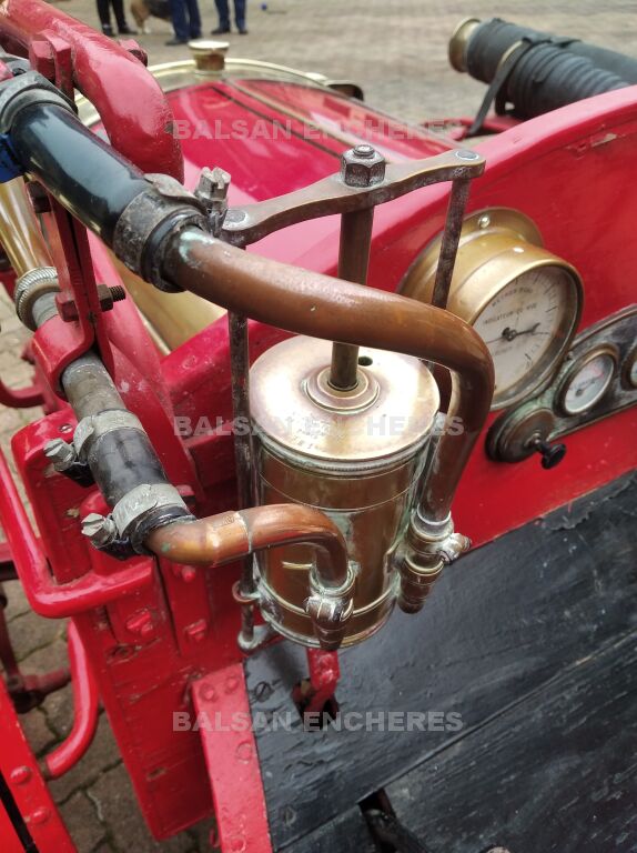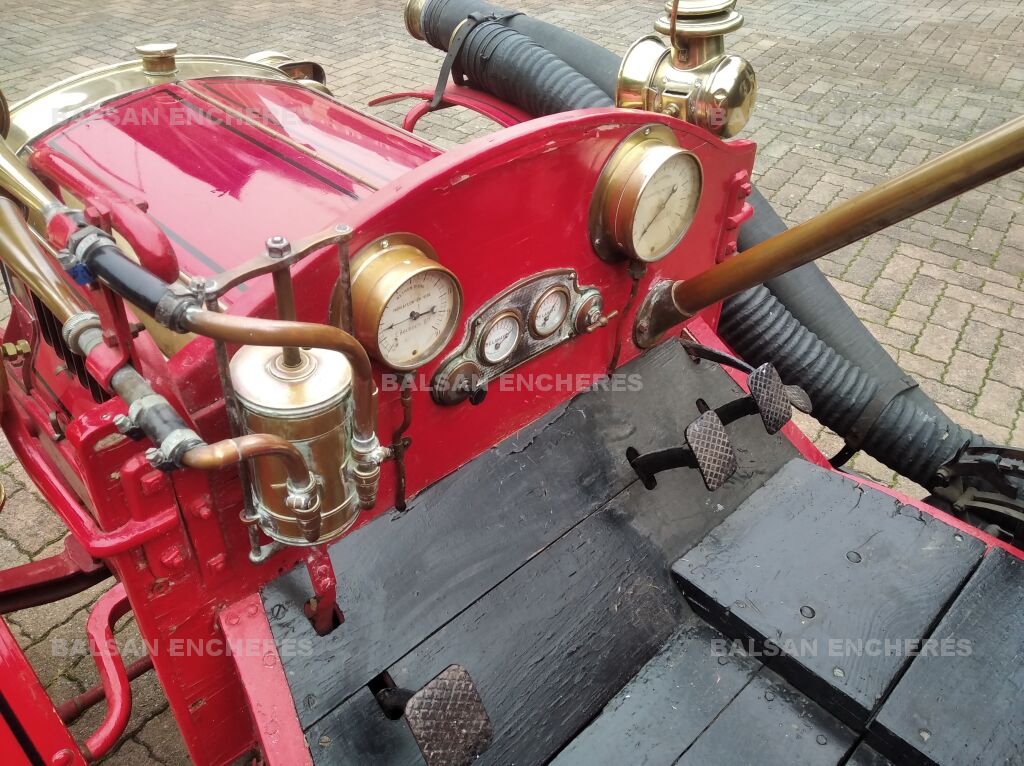 Ormis la pompe Farcot, il est équipé en sus de ses quatre tuyaux d'origine, de deux superbes phares à acétylène de marque BRG, de lanternes additionnelles en parfait état, de plusieurs raccords et de tous ses cadrans de conduite.