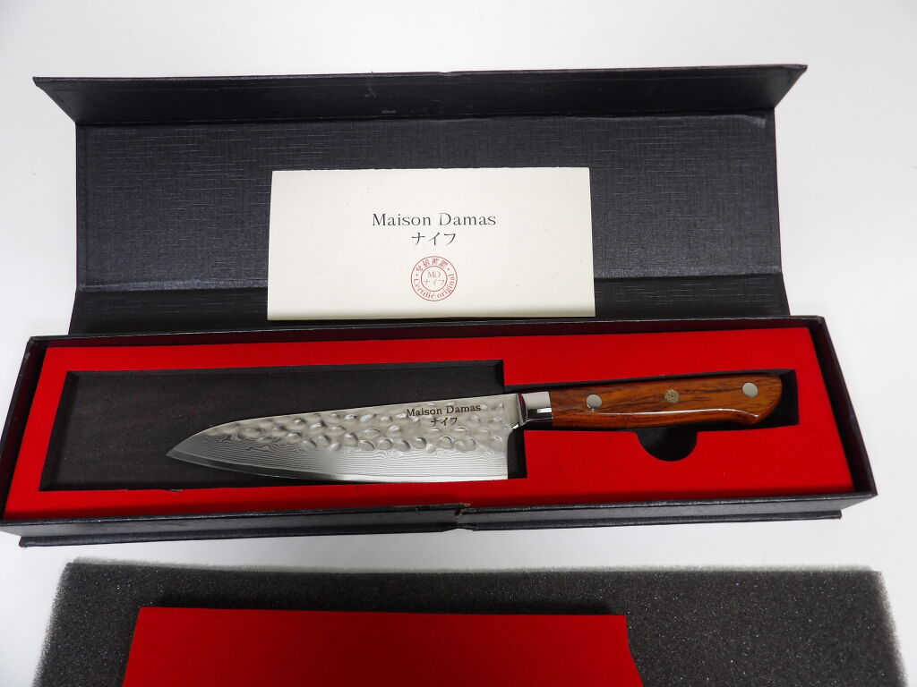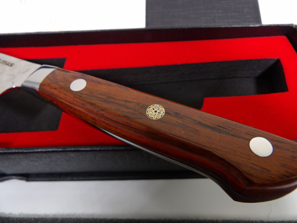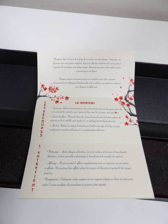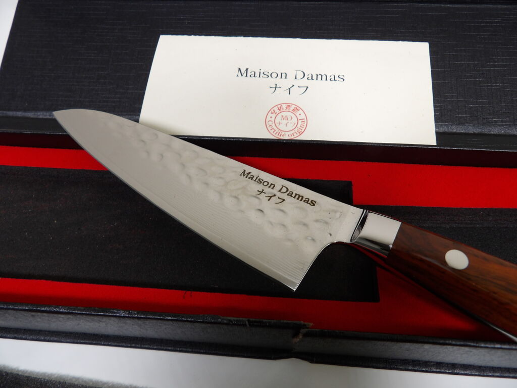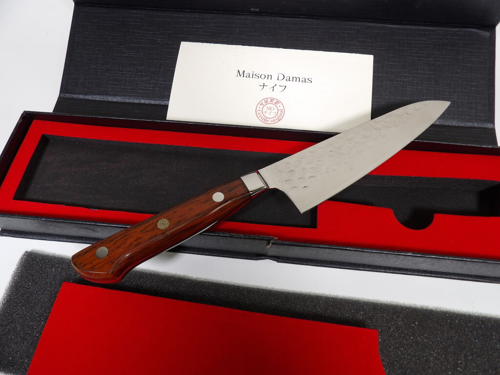 - Maison Damas - Magnifque Couteau honesuki Shimoza ( Lame en acier damas 67 couches et aiguisée à 15° sur chaque face - Manche en rosier) Prix boutique: 94 euros