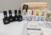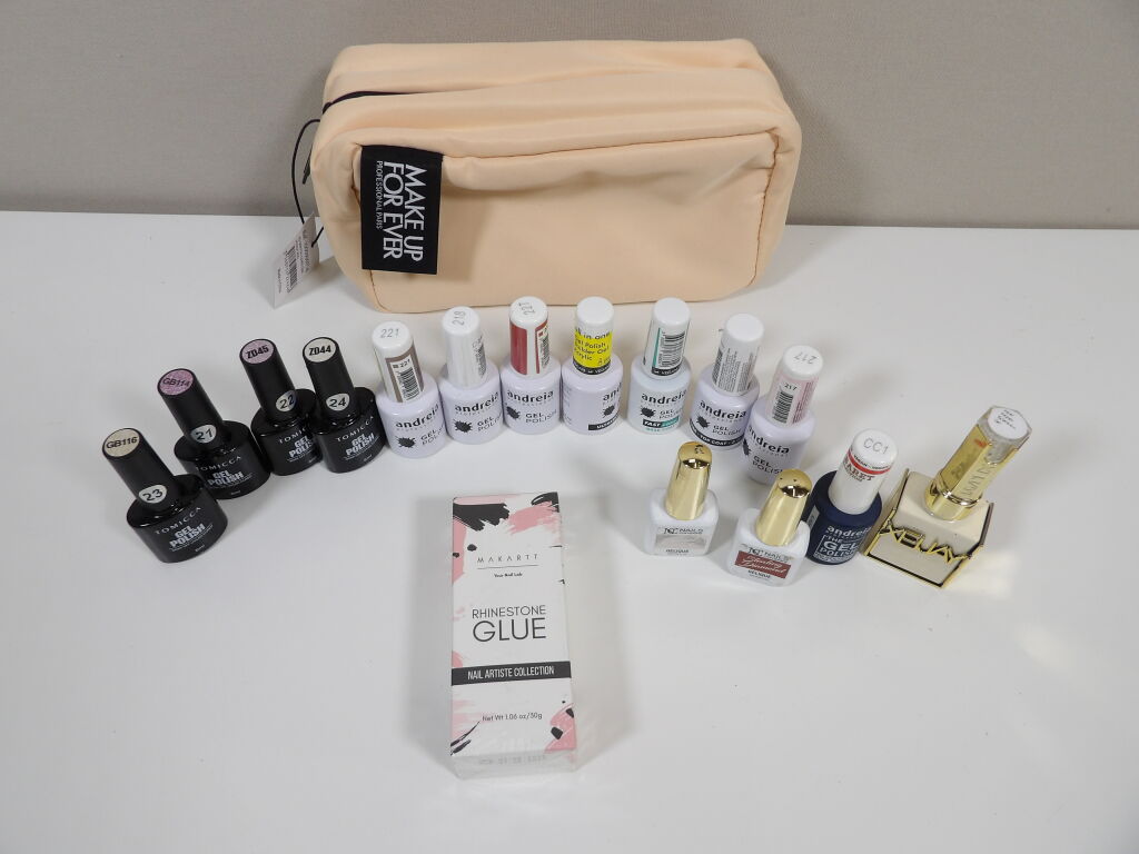 Lot de 17 articles ONGLERIE (trousse rangement maquillage - colle faux ongles - vernis gel polish marque andreia ...)
