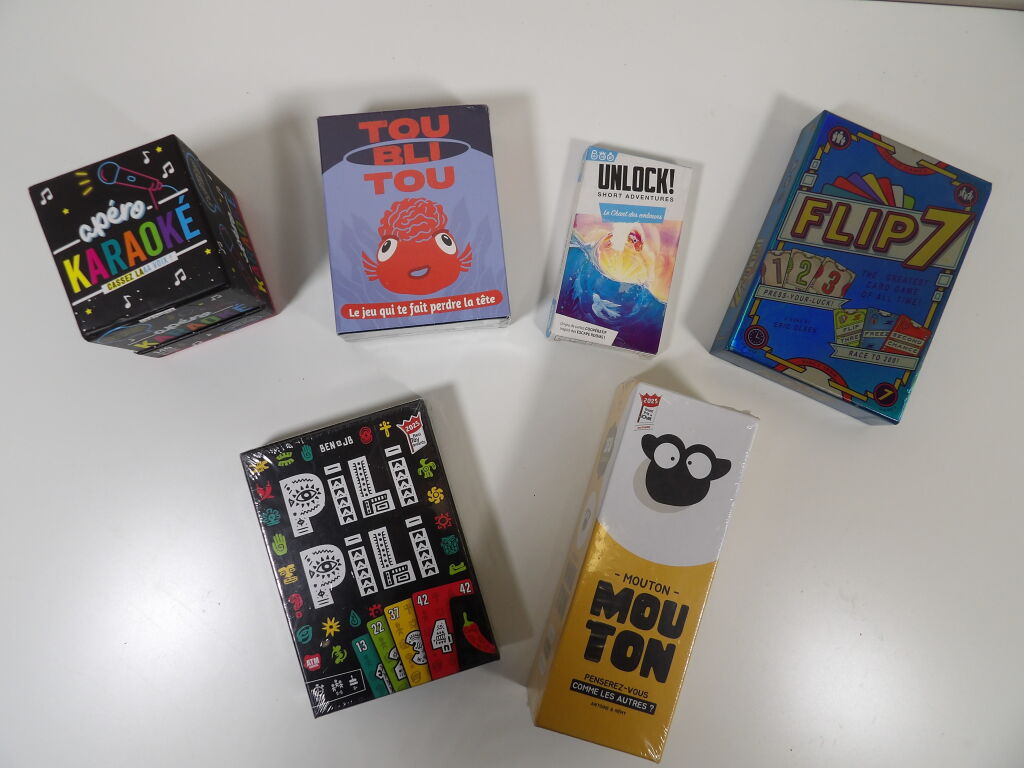 Lot de 6 Jeux de société - Neufs et occasion - APERO KARAOKE - PILI PILI - MOUTON MOUTON - TOU BLI TOU - FLIP 7 - UNLOCK Complétude non assurée - vendu en l'état **
