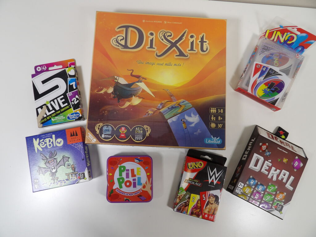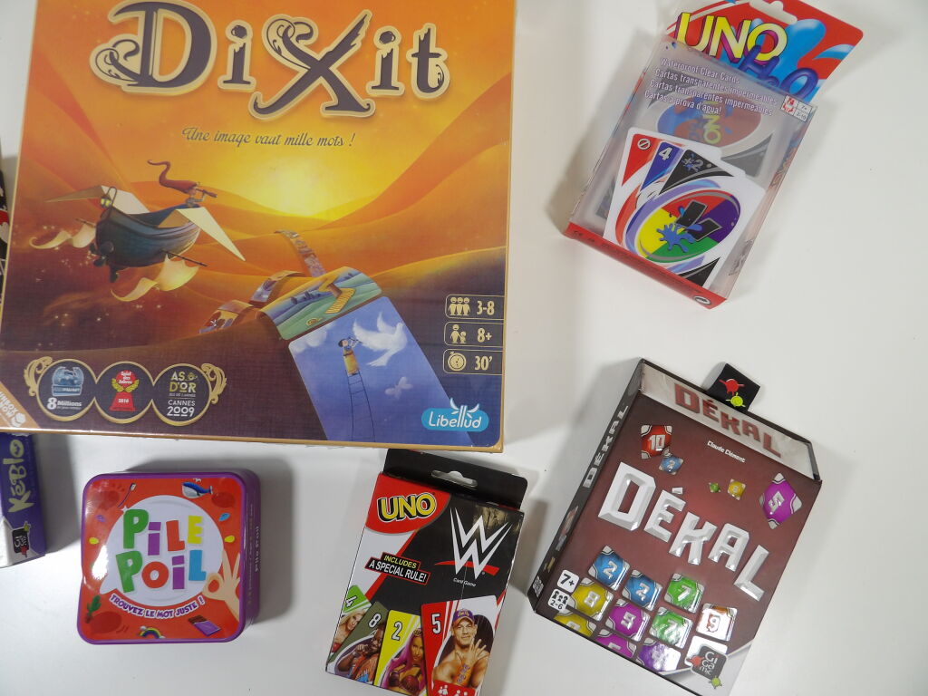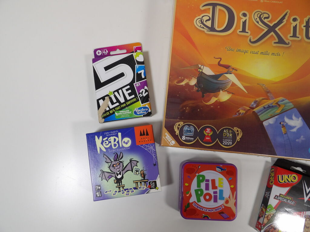 Lot de 7 Jeux de société - Neufs et occasion UNO W card game - DEKAL - PILE POIL - 5 LIVE - KEBLO - UNO H 2 0 - DIXIT- Complétude non assurée - vendu en l'état **