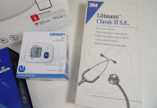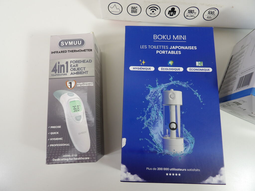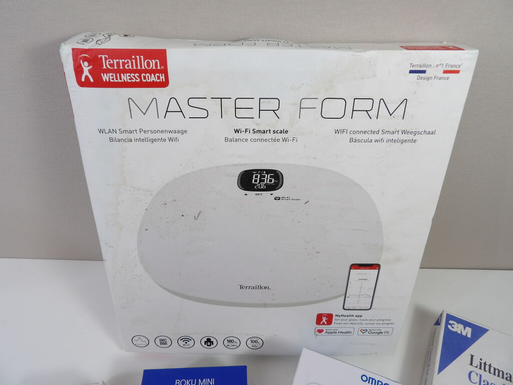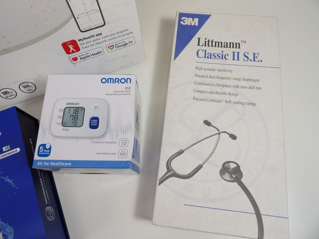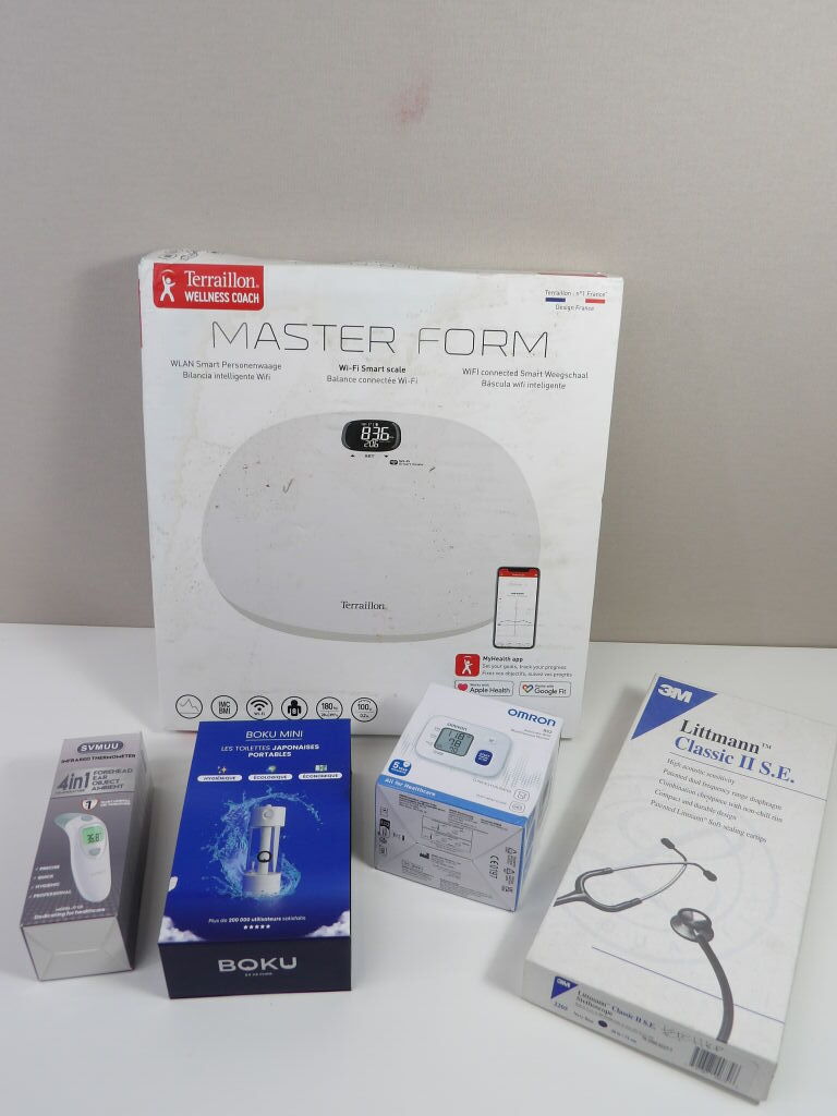 Lot Médical / Soins x5 articles : Pèse personne Terraillon (emballage abimé), Themomètre infrarouge pour mesure de température corporelle, Tensiomètre automatique, Stéthoscope, et on y inclut un BOKU.