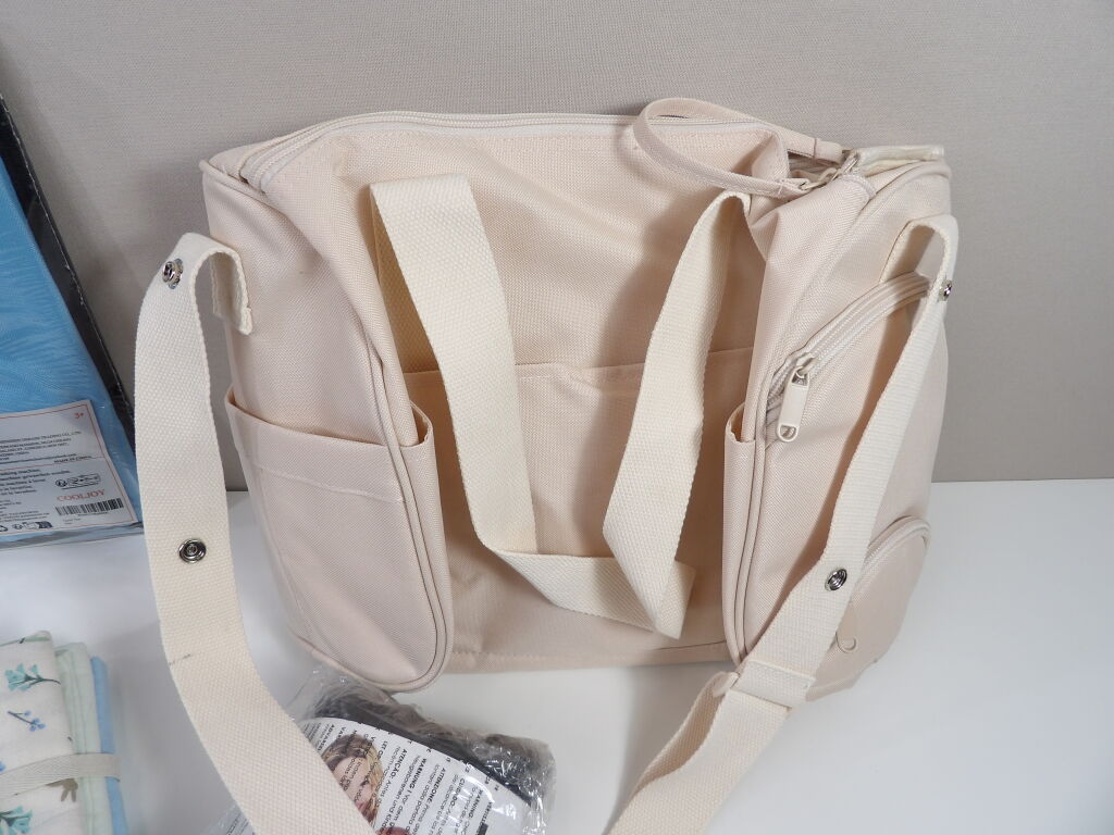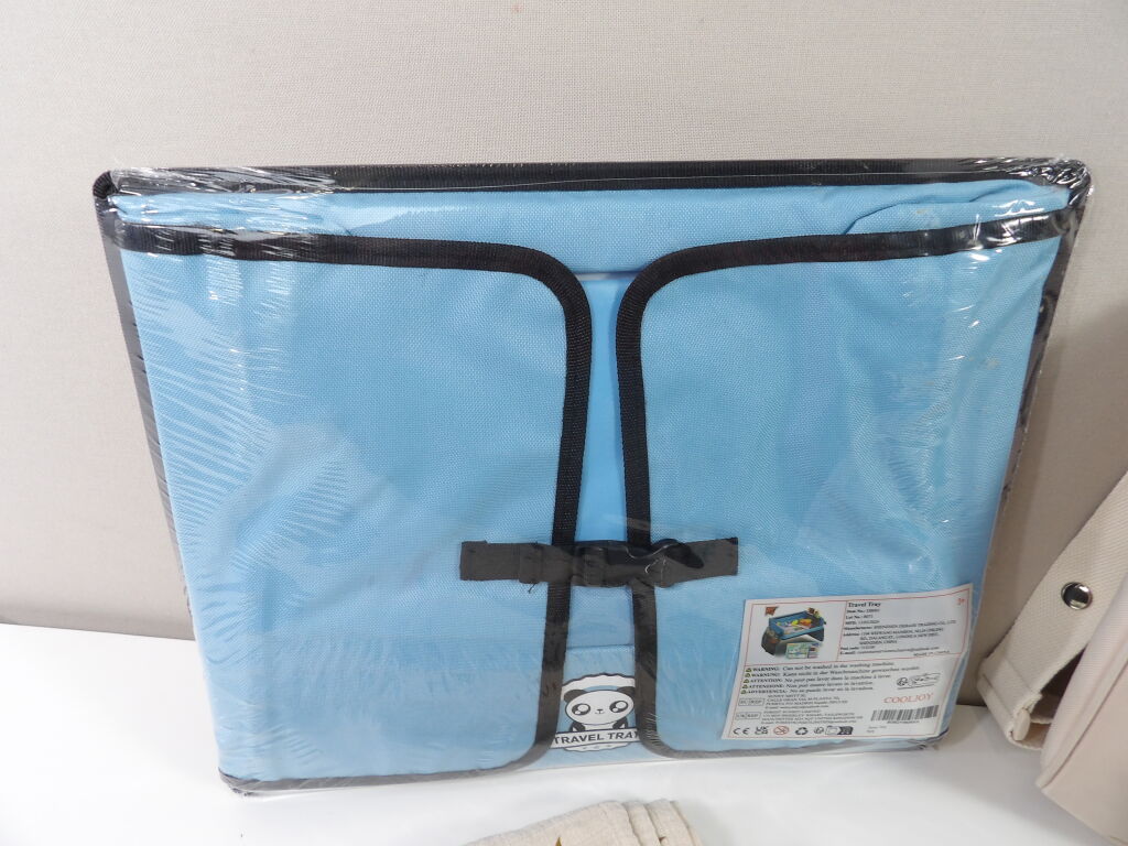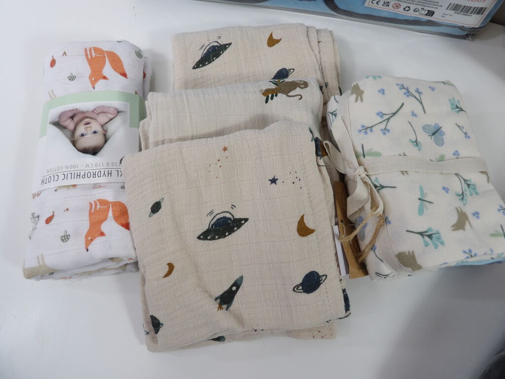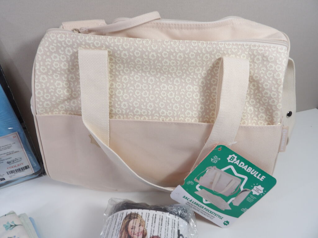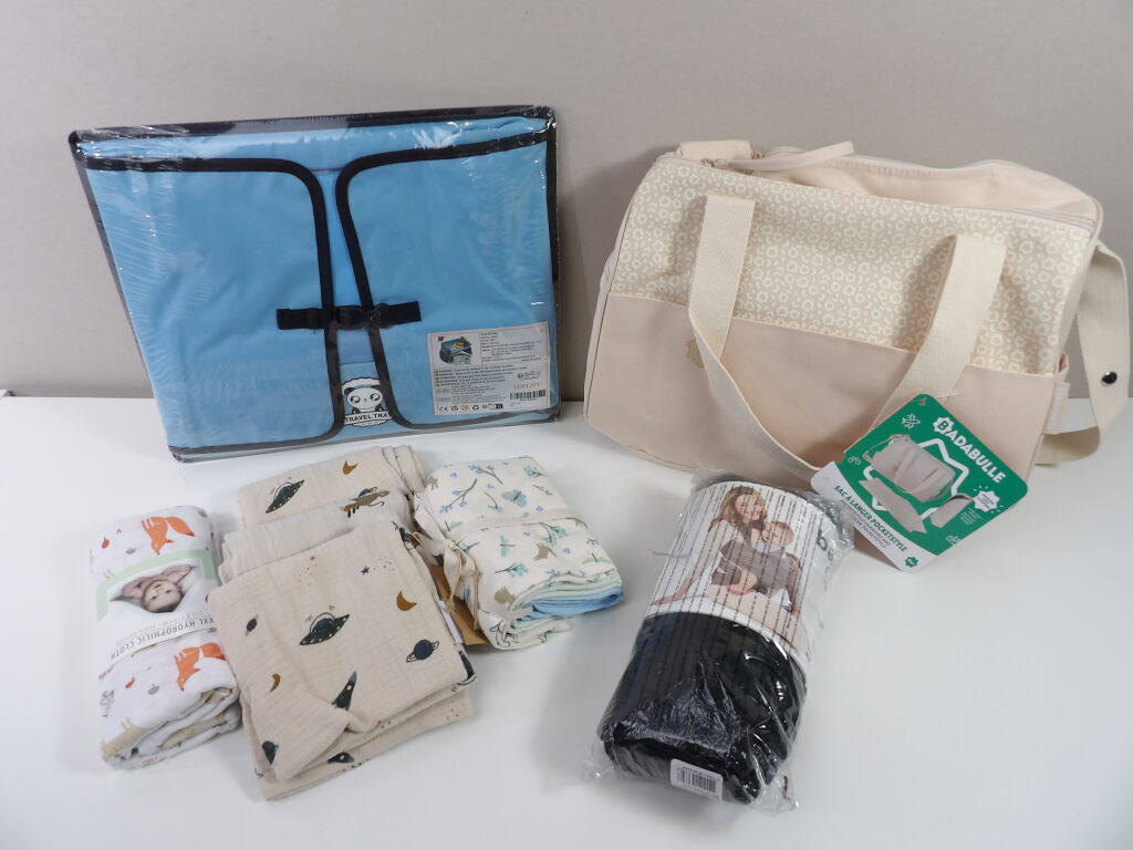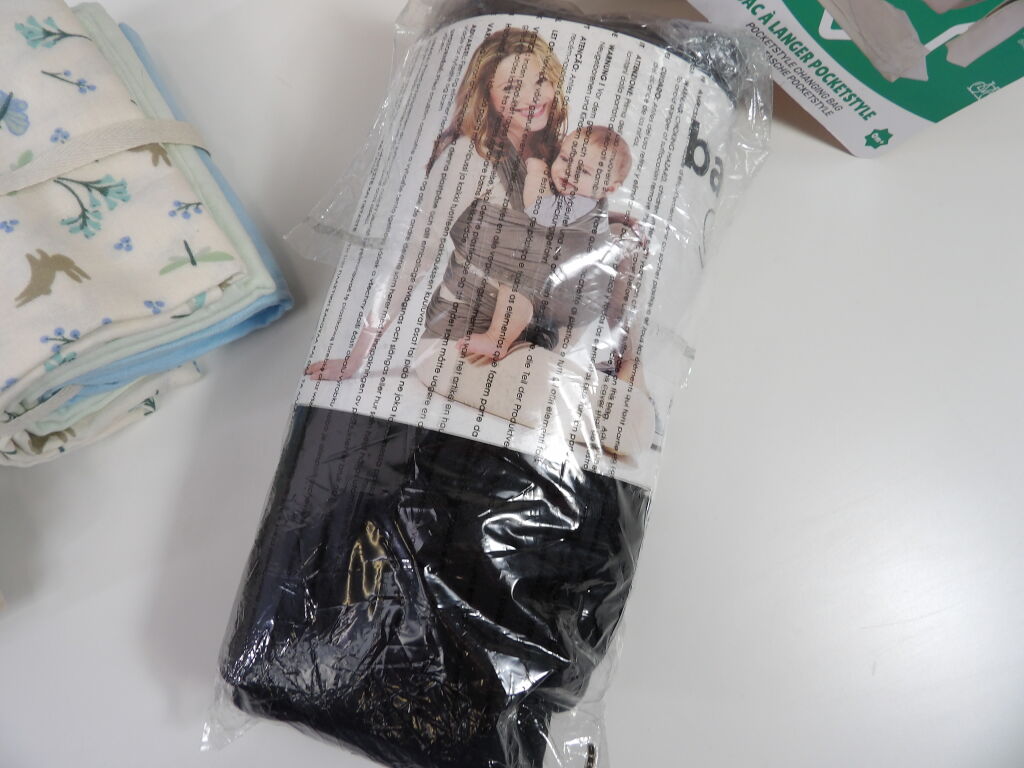Lot PUERICULTURE spécial TRANSPORT - Neufs : Sac à langer BADABULLE, Plateau de Voyage Enfant Voiture; x7 langes, et Echarpe de portage Love Radius Basic.