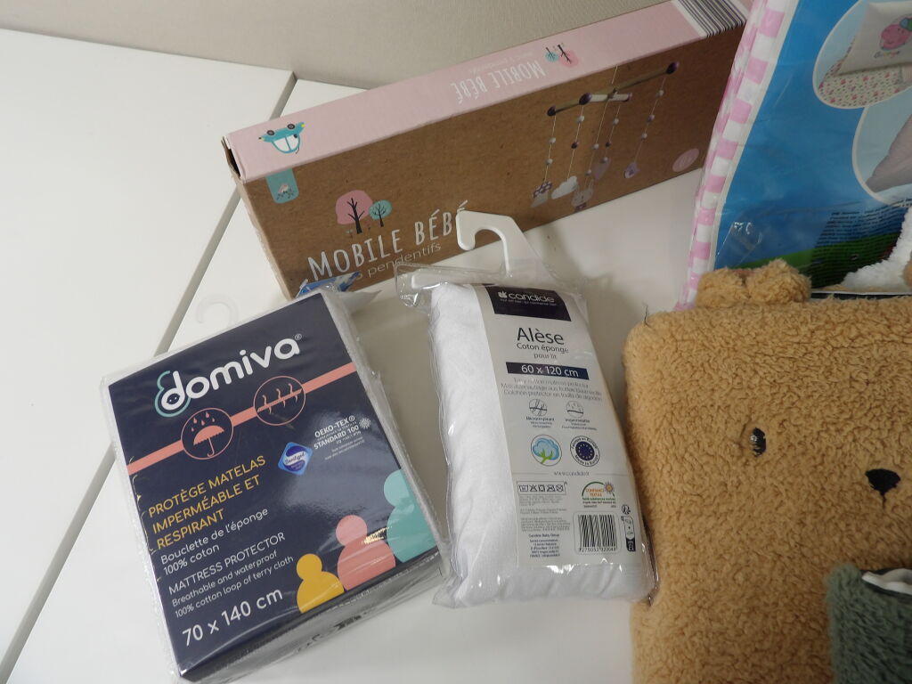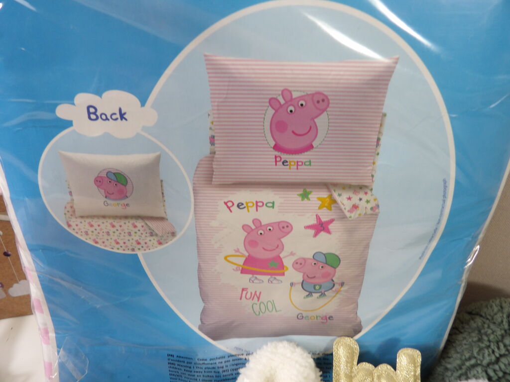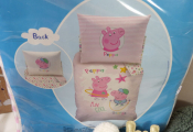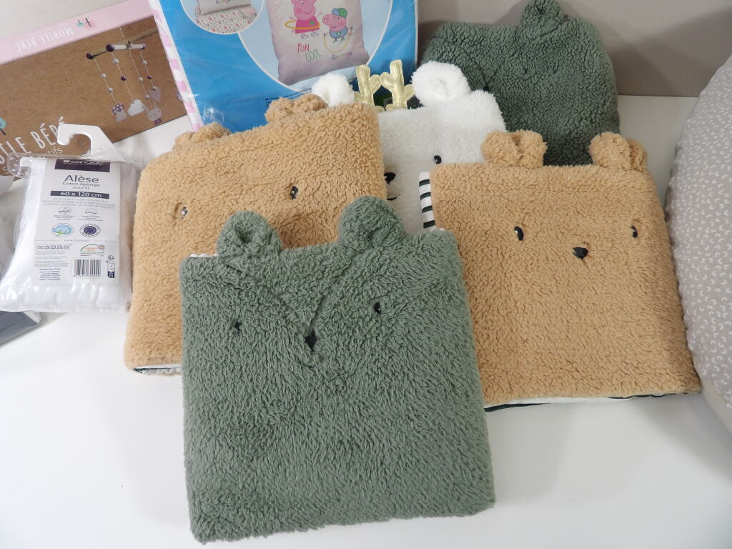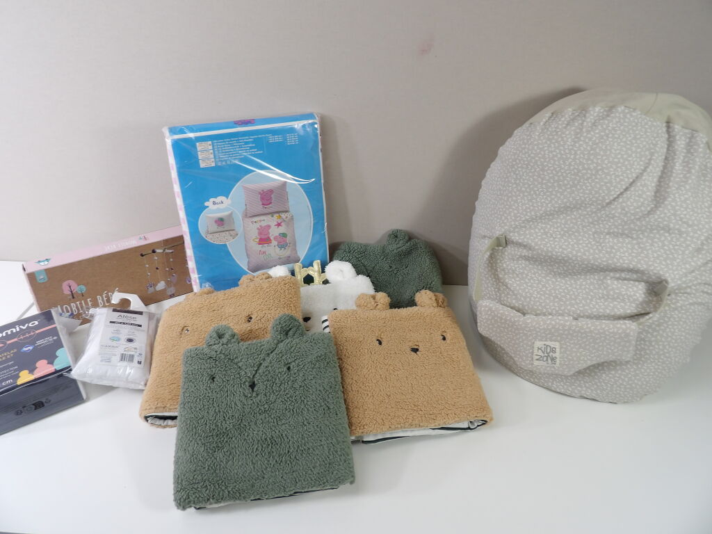 Lot PUERICULTURE x6 articles occasion et neuf: Fauteuil-coussin bébé KIDS ZONE by Jané, Mobile bébé en bois, x2 alèse / protège matelas, un ensemble housse couette et oreiller PEPPA PIG 160x210CM; et x6 VERBAUDET Tour de lit / Tour de parc.