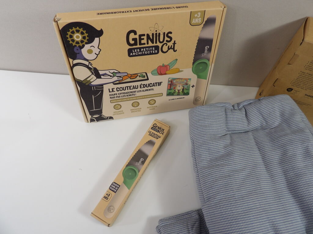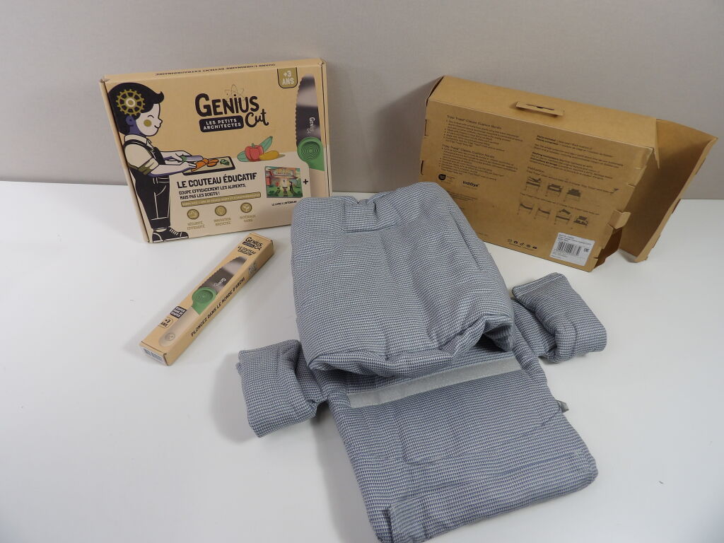Lot REPAS pour bébé / enfant : couteaux éducatifs GENIUS CUT et STOKKE assise tissu Tripp Trapp Classic Nordic.