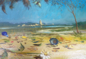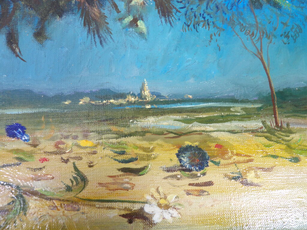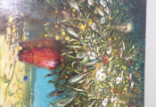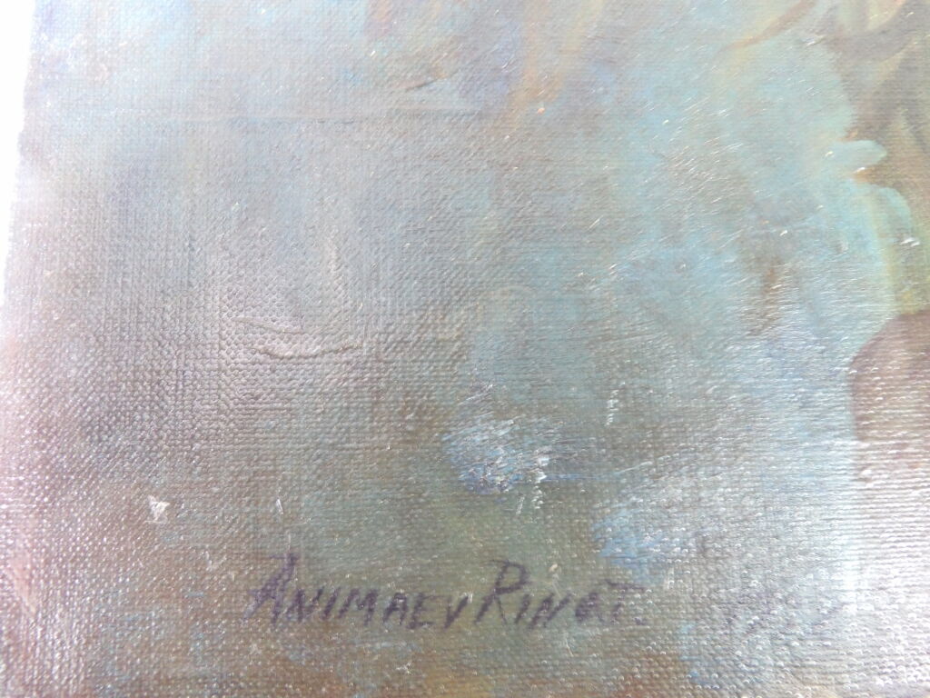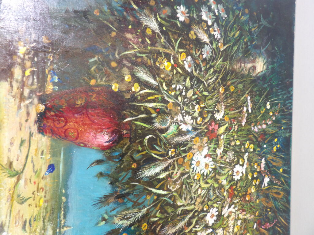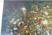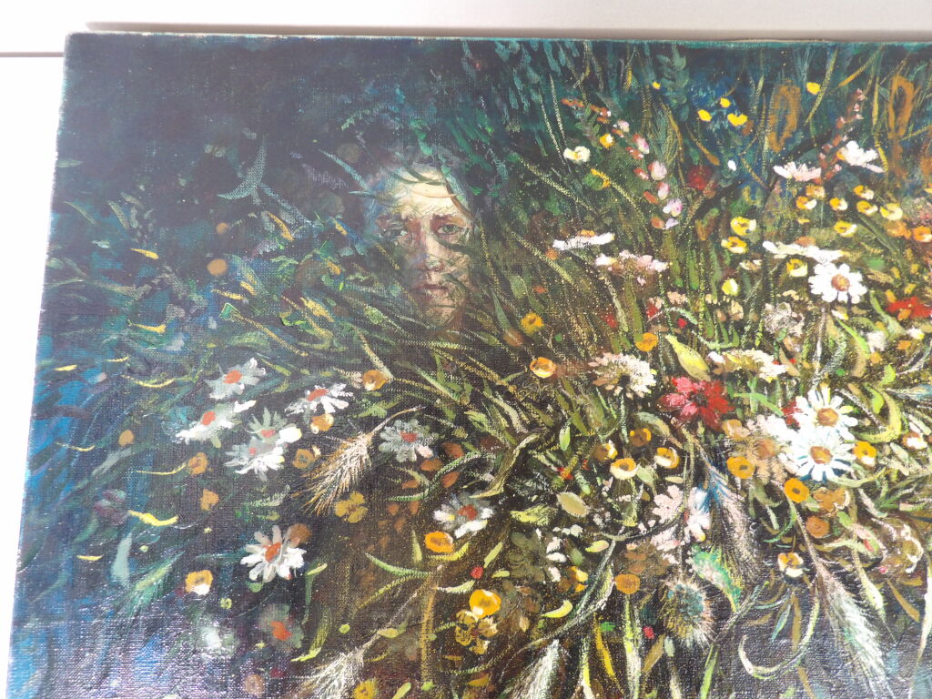 Rinat Animaev (1955 Tadjikistan) peintre de l'école russe XXe arrivé en France en 1989, installé à Dinan. Huile sur toile "visage de femme dans le bouquet de fleurs" 80 x 60 cm signé en bas à gauche daté 1997.