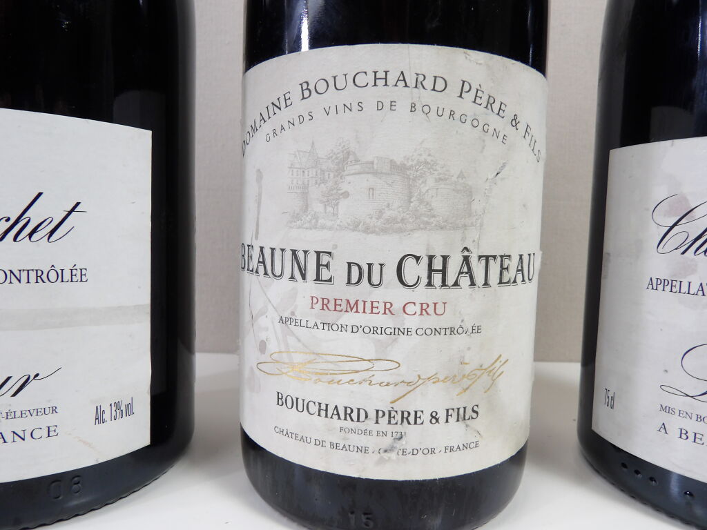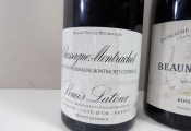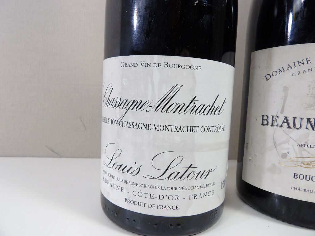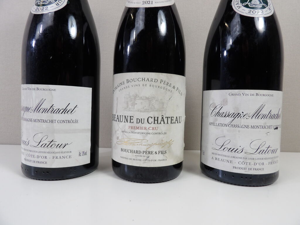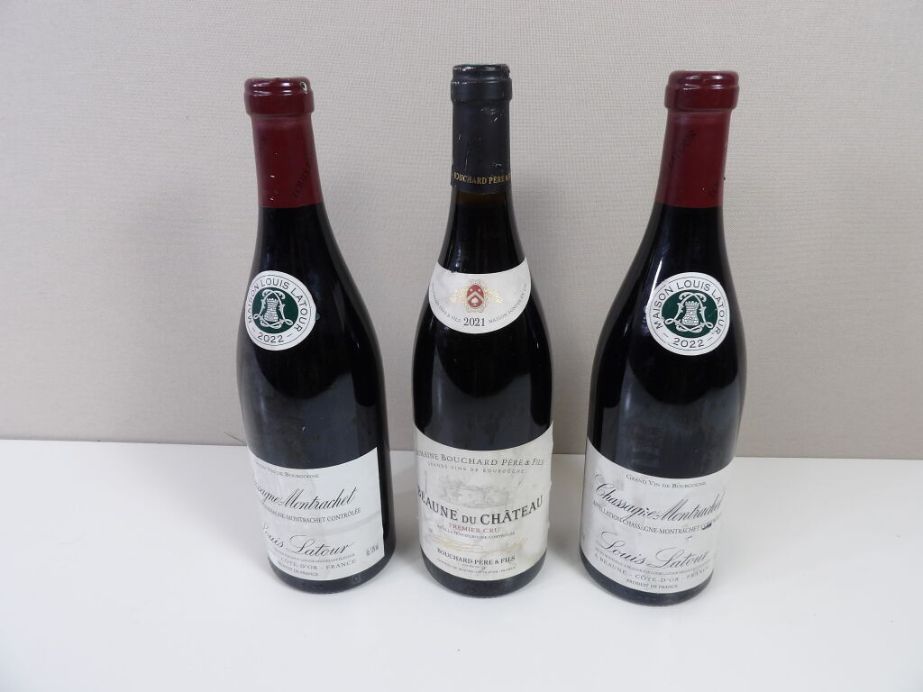 Vins de Bourgogne : 2 bouteilles de Chassagne-Montrachet (rouge) Louis Latour 2022 et une de Beaune du château Premier Cru Bouchard Père & Fils 2021