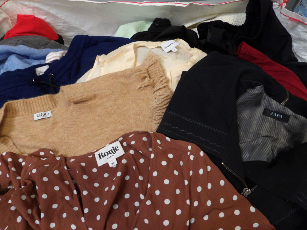 Palette de 200 pièces de vêtements d'occasion et certains neufs : Femme, Enfant, Homme ( divers gammes et marques dont Rouje - Zapa - The Kooples...) - ATTENTION ce lot est d'occasion tous états et contient divers gammes donc de l'entrée type KIABI aussi. il n'est pas composé uniquement des marques citées.