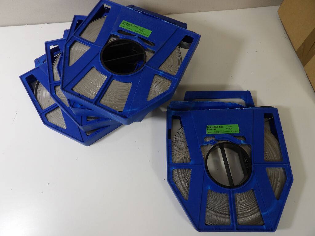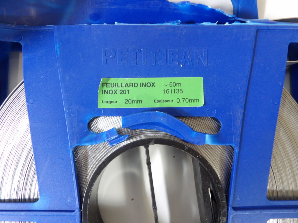 5 Bobines de feuillard inox Petitjean largeur 20 mm, épaisseur 0,7 mm longueur environ 50 m.