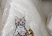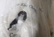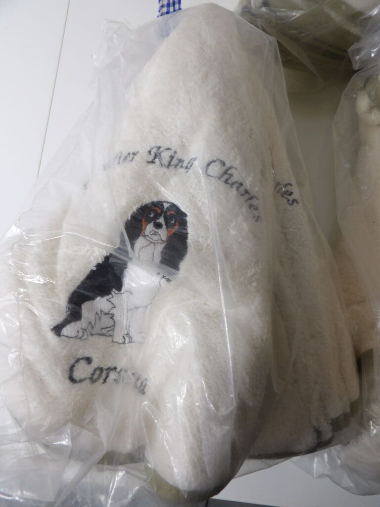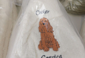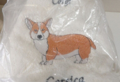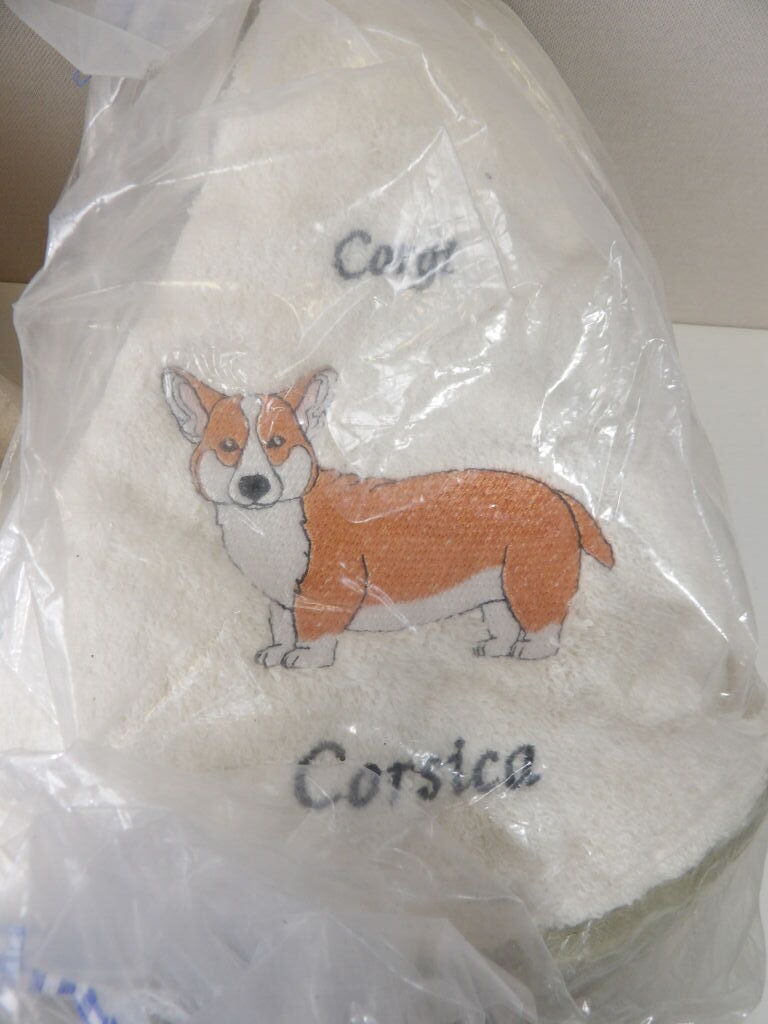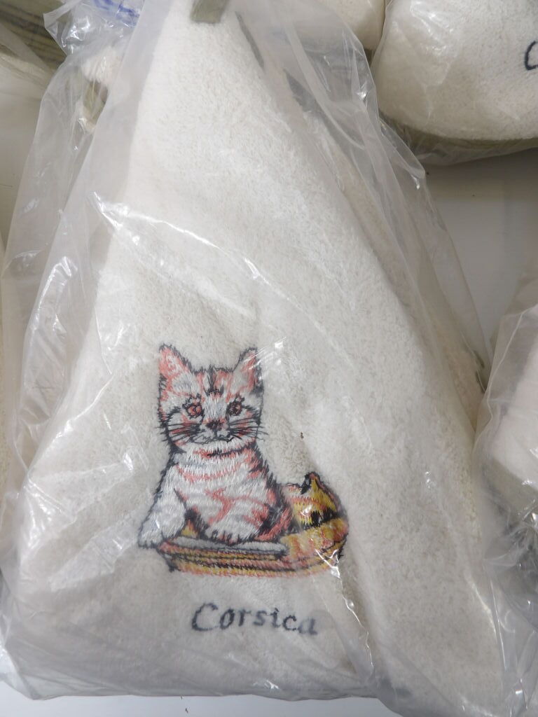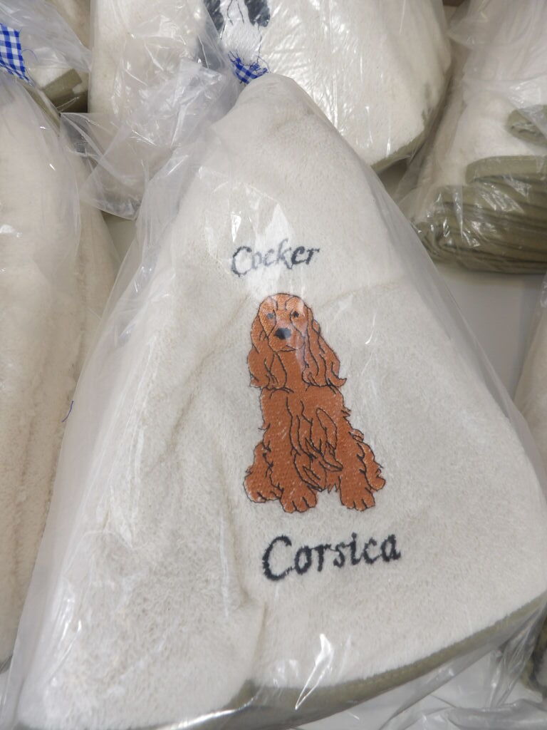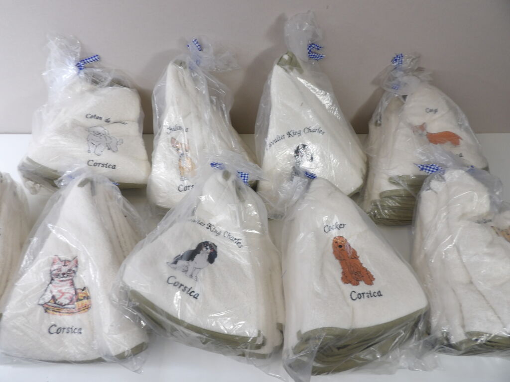 Lot de 100 essuies mains ronds, souvenirs de corse, brodés principalement de différentes races de chien : corgi, cocker, cavalier King Charles ...