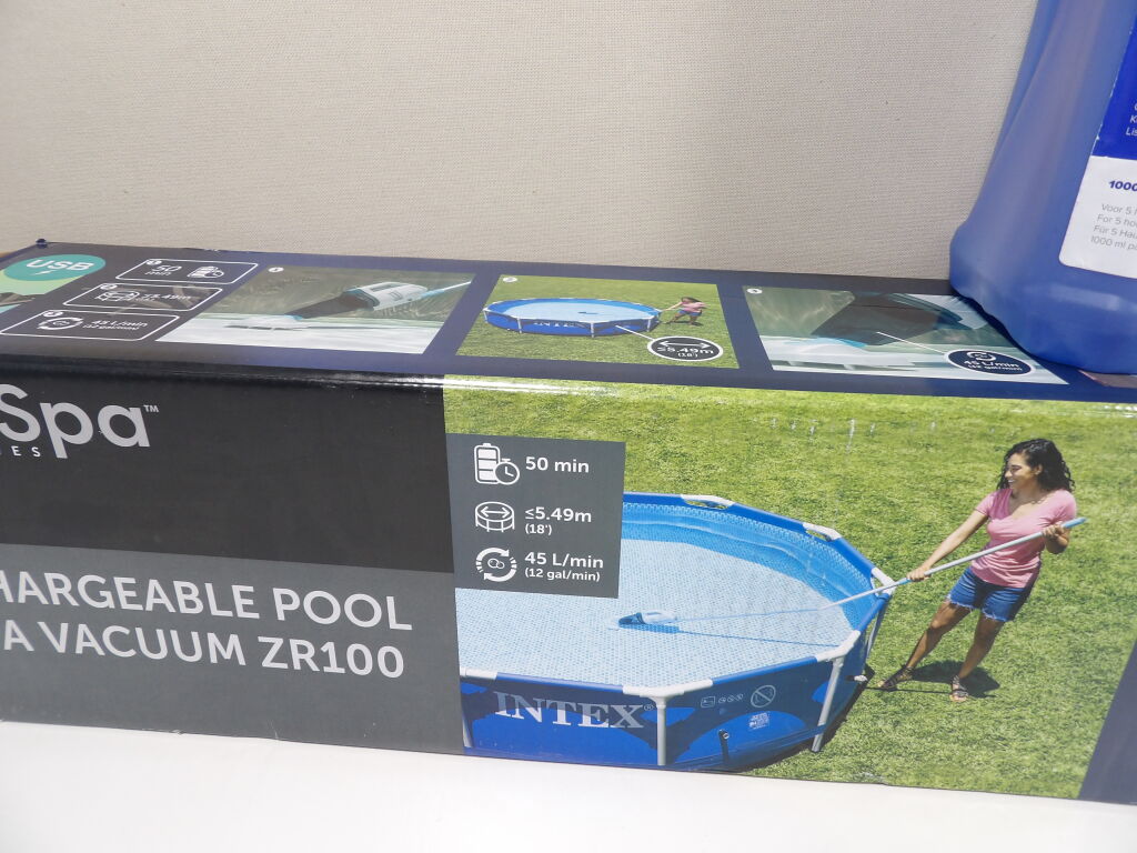 SPA / PISCINE - Lot de 2 articles: INTEX: Nettoyeur à batterie ZR100 + Nettoyant concentré pour résine adoucisseur. Bidon de 5 Litres (abîmé)