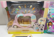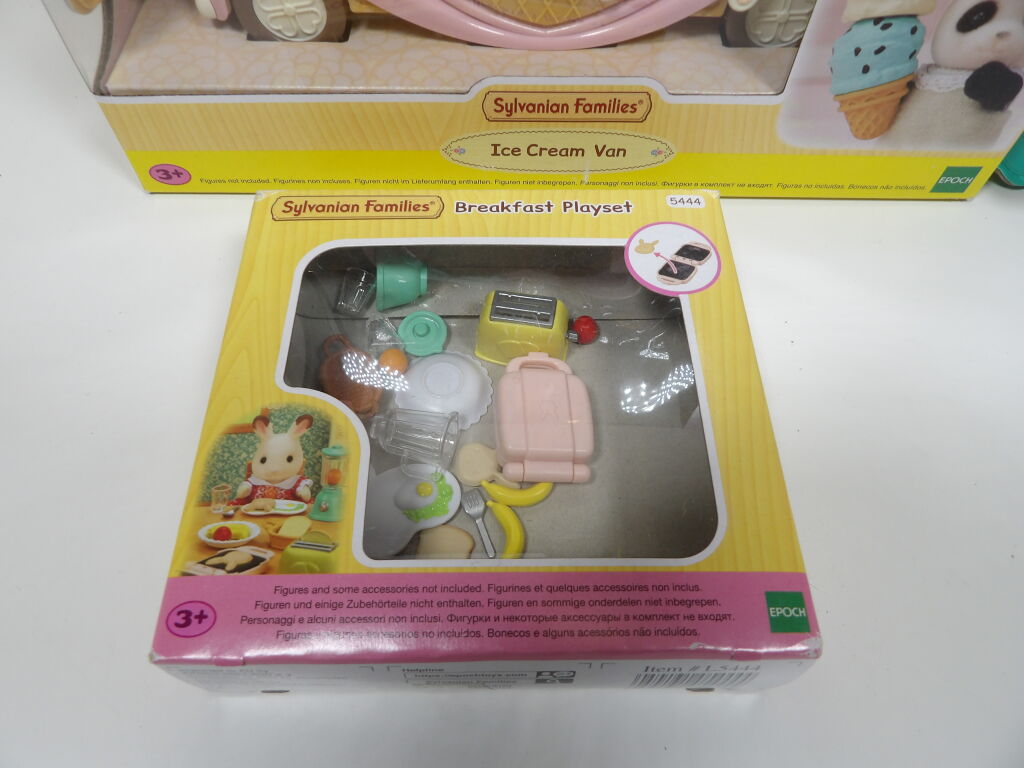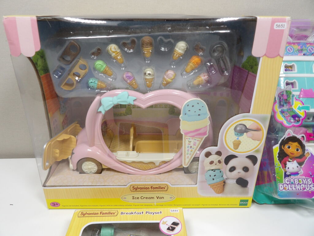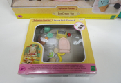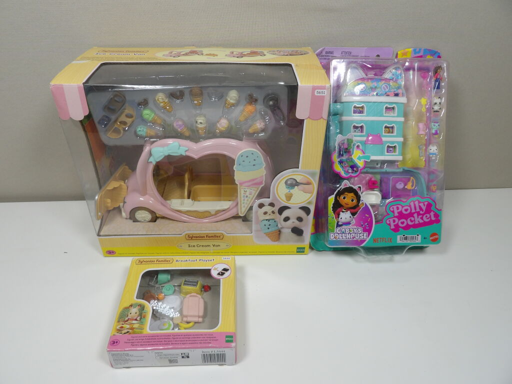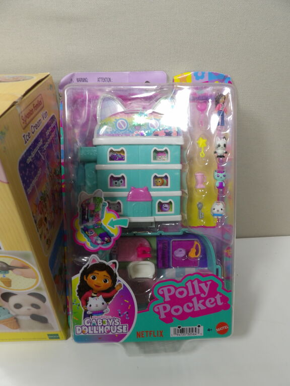 Sylvanian Families le camion marchand de glaces, on y joint des accessoires (occasion) et un jeu Polly Pocket sous blister (emballage abîmé).