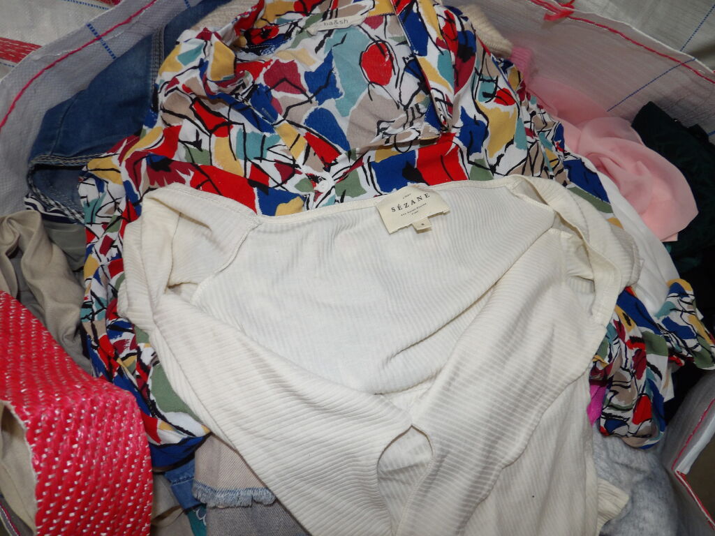1/2 palette de 85 pièces de vêtements d'occasion et certains neufs : Femme, Enfant, Homme ( divers gammes et marques dont Ba&sh - Sézanne ...) - ATTENTION ce lot est d'occasion tous états et contient divers gammes donc de l'entrée type KIABI aussi. il n'est pas composé uniquement des marques citées.
