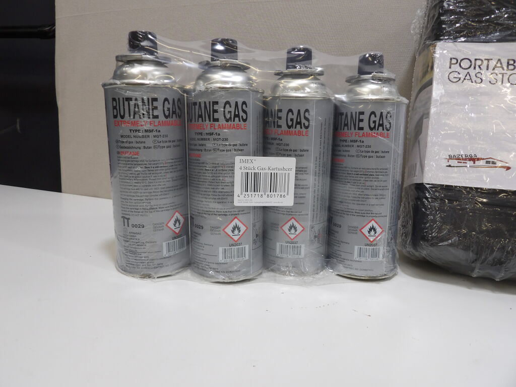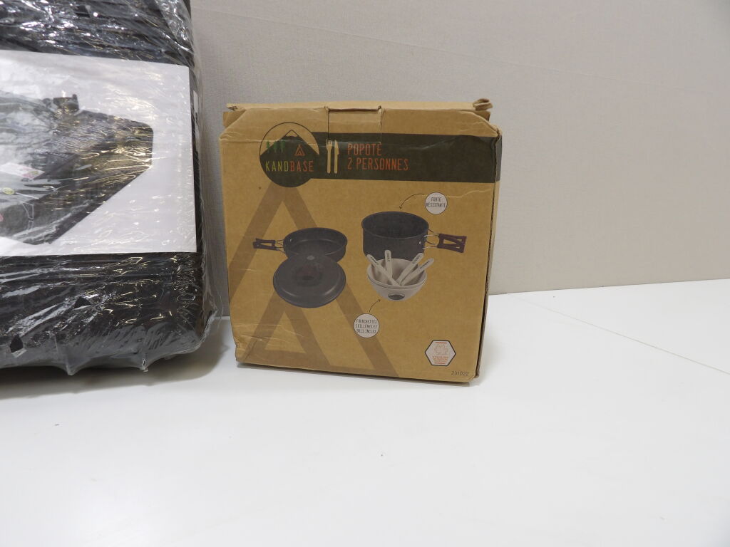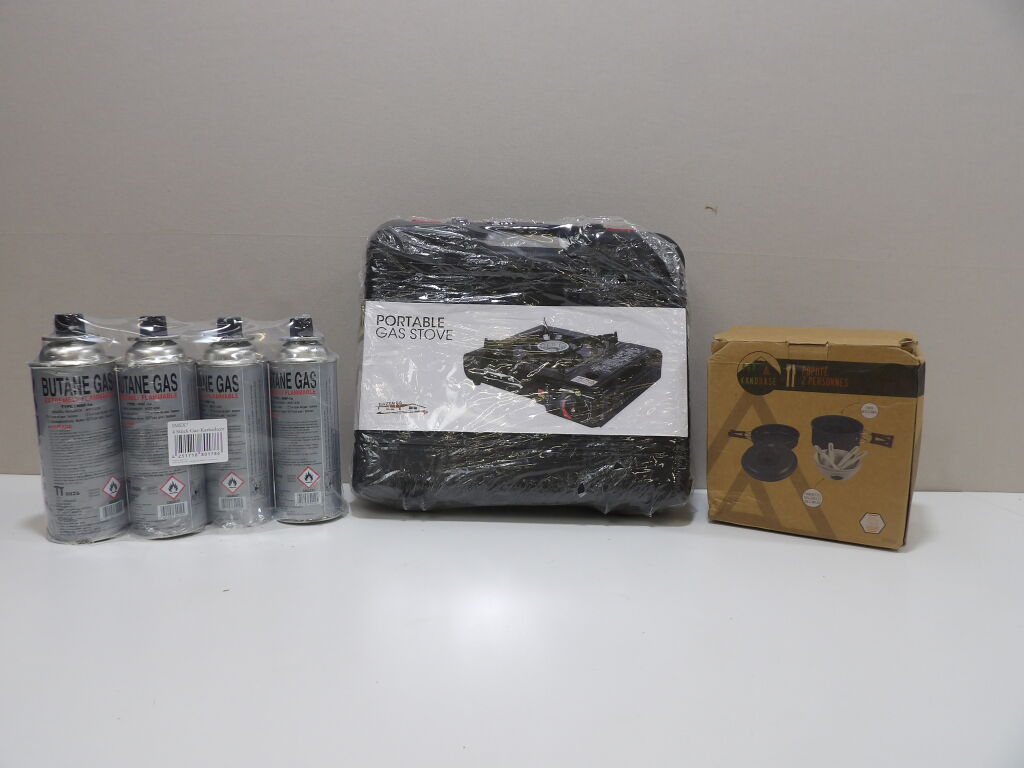 CAMPING : Lot de x3 articles neufs et occasion : x4 Butane gas, x1 Popote pour 2 personnes et x1 Portable gas.