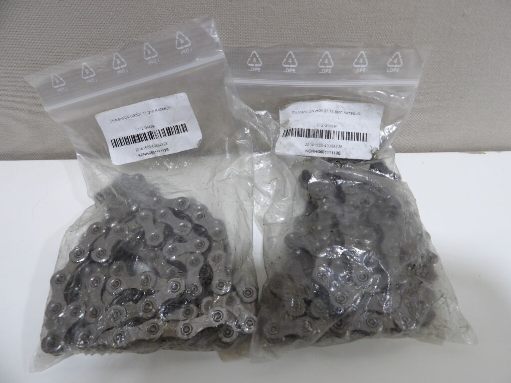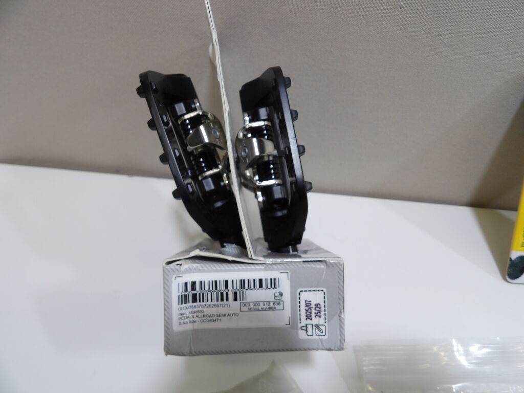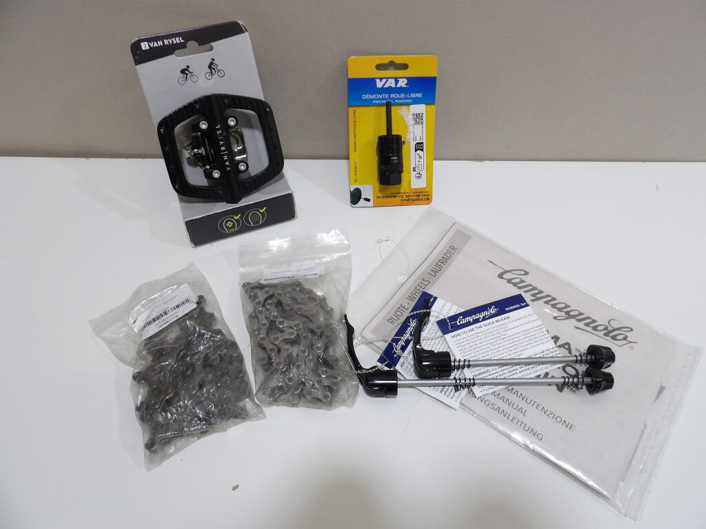 CYCLISME - 1 lot de pièces d'articles NEUFS de vélo: Pédales plates semi-automatique pour la route et la ville Décathlon - 2 axes de roues CAMPAGNOLO à démontage rapide - 1 démonte roue libre - 2 chaines Shimano 116 maillons